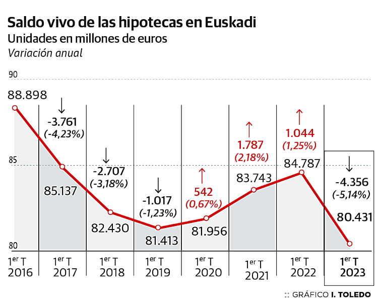 Sin precedentes. La amortización del crédito hipotecario en Euskadi no tiene un registro como el del último año desde la crisis inmobiliaria de 2008. Nunca ... se había pagado tanto para adelantar la devolución de esos préstamos y escapar así de la subida del euríbor que, solamente en un año, se ha multiplicado por doce hasta alcanzar el 4%. Con sus aportaciones, las familias y empresas vascas han reducido en 4.356 millones la cantidad del saldo vivo del conjunto de préstamos con garantía inmobiliaria que hay suscritos en Euskadi. El montante total es de 80.431 millones, el más bajo desde hace más de 15 años.