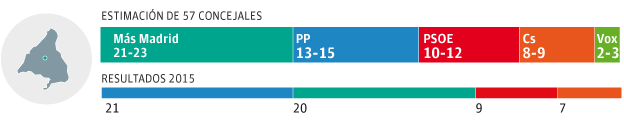 De cerca le seguiría el PSOE, con un 18,4% de los sufragios y entre 10 y 12 concejales, con lo que su candidato, el exseleccionador de baloncesto Pepu Hernández, podría sumar hasta tres concejales más que en la actualidad. Ciudadanos, por su parte, también sube y obtendría entre 8 y 9 ediles (un 14,2% de votos), mientras que Vox entraría en la Cámara madrileña con un apoyo del 5,8% y 2-3 ediles. IU, por su parte, se conformaría con un 2,2% de los votos.