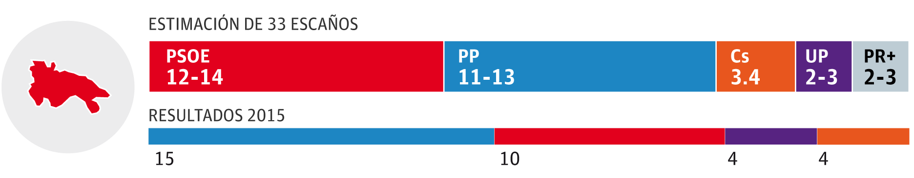 El PSOE obtendrían entre 12 y 14 escaños, cuatro escaños más que en 2015 cuando lograron diez. El PP sería la segunda fuerza más votada con el 30% de los votos y sacaría entre 11 y 13 diputados autonómicos frente a los quince actuales. En el caso de Unidas Podemos la encuesta le otorga entre dos y tres escaños, los mismos que al PR+, que regresaría de nuevo a la Cámara riojana y tendrían la llave del Gobierno. Ciudadanos se mantendría en el mismo resultado y obtendría entre 3 y 4 escaños.