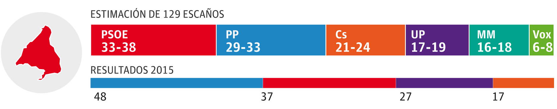 La hegemonía popular en Murcia no estaría en peligro según los datos que maneja el CIS, todo pese a que el PSOE ganaría las elecciones de la región 28 años después, gracias a los 14-17 que les otorga el barómetro, lo que solo le serviría para quedarse cerca de la mayoría absoluta (23 escaños) ya que Podemos sumaría entre 4 y 5 asientos . Con una horquilla de entre 12 y 14 escaños, al actual presidente, Fernado López-Miras -que llegó al cargo tras la imputación de su antecesor, Pedro Antonio Sánchez- tendría que contar con los votos de Ciudadanos (8-9), que sube, y Vox (4-5), que irrumpiría en un nuevo parlamento.