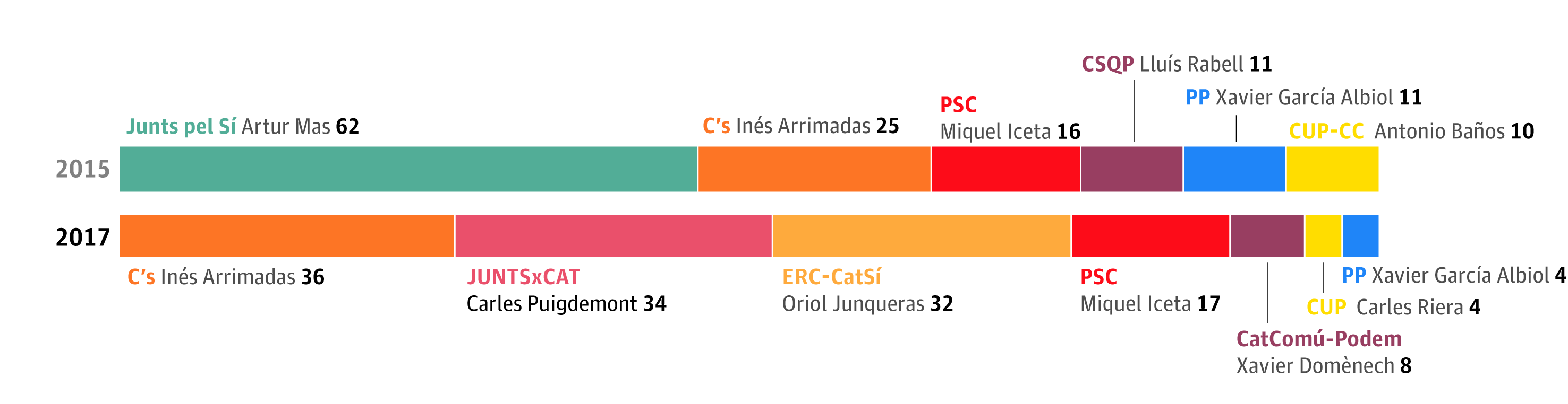 27 de septiembre de 2015: Junts pel Sí (una coalición secesionista integrada por CDC y ERC) obtiene 62 diputados y la CUP, 10. Mayoría absoluta en escaños, pero no en votos. Aun así, las dos formaciones prometen la independencia en 18 meses. El 'procés' se acelera.