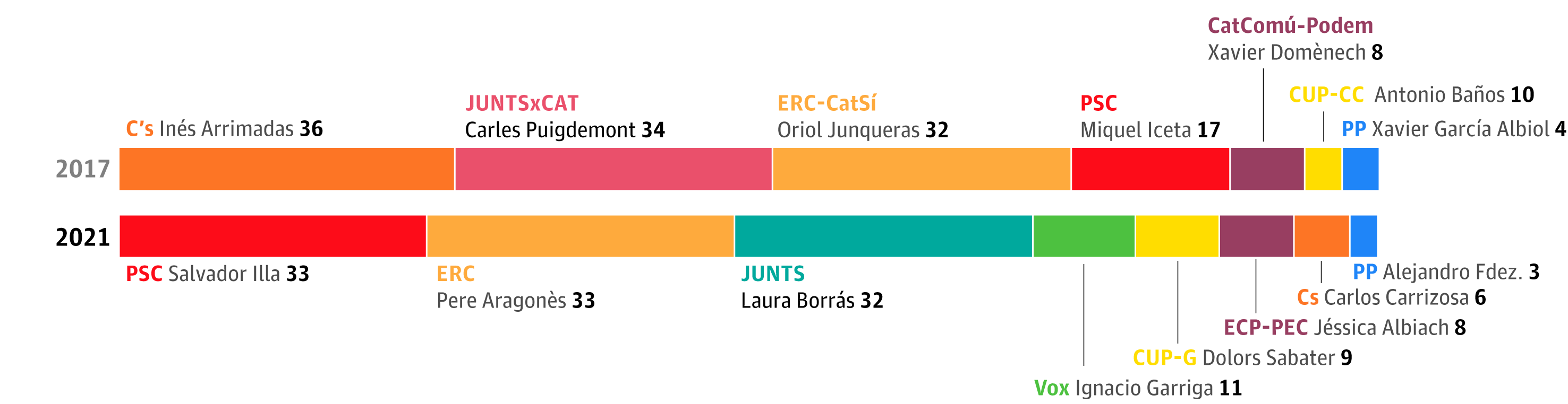 21 de octubre de 2017: Elecciones en Cataluña. JxCat, ERC y la CUP reeditan la mayoría absoluta. Ciudadanos se convierte en primera fuerza del Parlament. Por primera vez gana una fuerza política no catalanista.