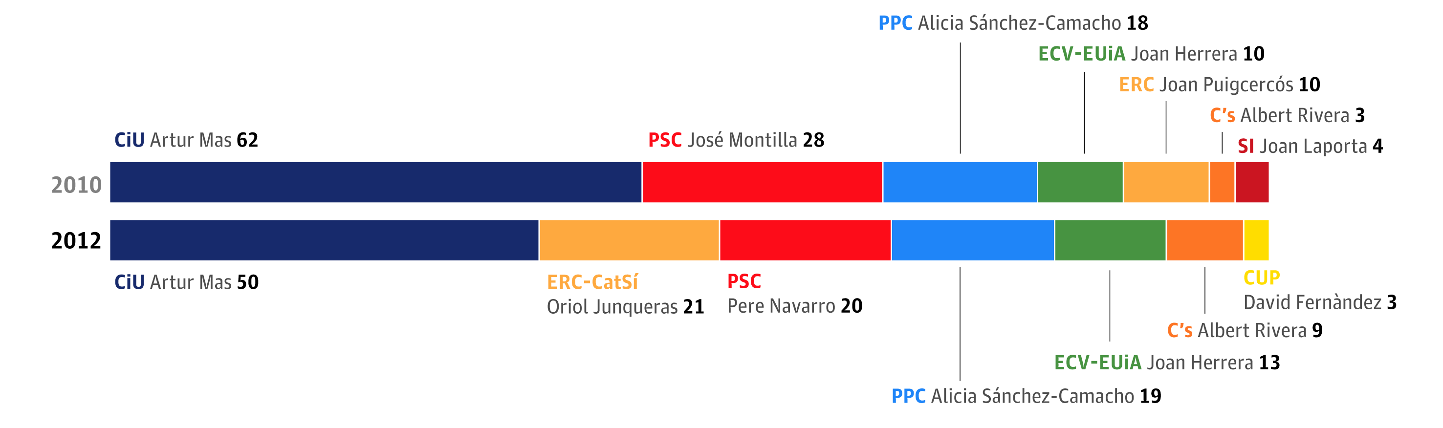25 de noviembre de 2012: El resultado electoral no es el esperado por el nacionalismo y Mas sufre un retroceso electoral y pierde 12 escaños en las elecciones autonómicas. Aun así, CiU gana con 50 diputados y se alía con ERC, que obtuvo 21 (sobre 135). Arranca el 'procés' y se pone en marcha también la pugna, que aún dura, entre los dos partidos independentistas.