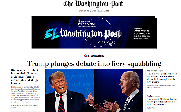 Para 'The New York Times' y 'The Washington Post', no queda nada claro que el líder republicano haya conseguido con su actuación recuperar la desventaja electoral que padece en los sondeos en relación a Biden. Es decir, parece poco probable que haya logrado «reiniciarse», como cita el primero de los rotativos, aunque sí habría satisfecho a sus seguidores de base y aquellos que acuden en masa a sus mítines para escuchar sus discursos 'Fast & Furious', más cercanos a la órbita del gallo de corral que de inquilino del Despacho Oval. Ahí coincide el periódico capitalino. Su análisis concluye que Trump ha conseguido con el debate televisado la «gran audiencia» sin filtros que la pandemia le ha negado hasta ahora debido a las restricciones de aforo y reunión. Eso sí, duda que sus argumentos y su actitud hayan persuadido a alguien entre ese 3% de electores que todavía se declara indeciso.