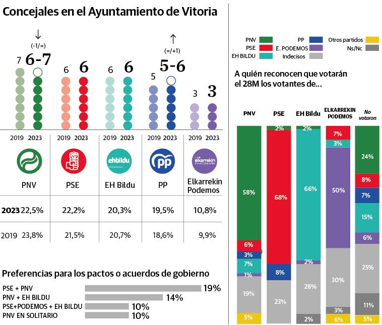 Los socialistas, por tanto, pisarían los talones a los jeltzales, con quienes han formado gobierno en las dos últimas legislaturas, y podrían repetir fórmula para los próximos cuatro años; eso sí, de nuevo en minoría y con una oposición algo más fuerte, con un concejal más en la bancada del PP. EH Bildu, mientras tanto, igualaría los resultados de hace cuatro años, y se le resistiría mejorar los resultados más brillantes de su trayectoria en Vitoria.