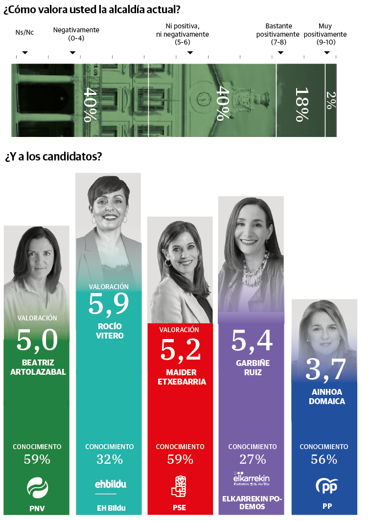 Esto implica que el termómetro de los pactos por gobernar Vitoria se mantendría a grandes rasgos de forma similar. Pero con dos condicionantes que se han fraguado a lo largo de la legislatura. Por un lado, la oposición ganaría músculo, lo que alejaría aún más la mayoría absoluta, una quimera en Vitoria. Además, daría un papel más protagonista a Elkarrekin Podemos, que según el sondeo de Ikerfel se mantendría inalterable. En caso de que se produjera el cuádruple empate, el gobierno necesitaría dos votos favorables, no sólo uno como en la actualidad.