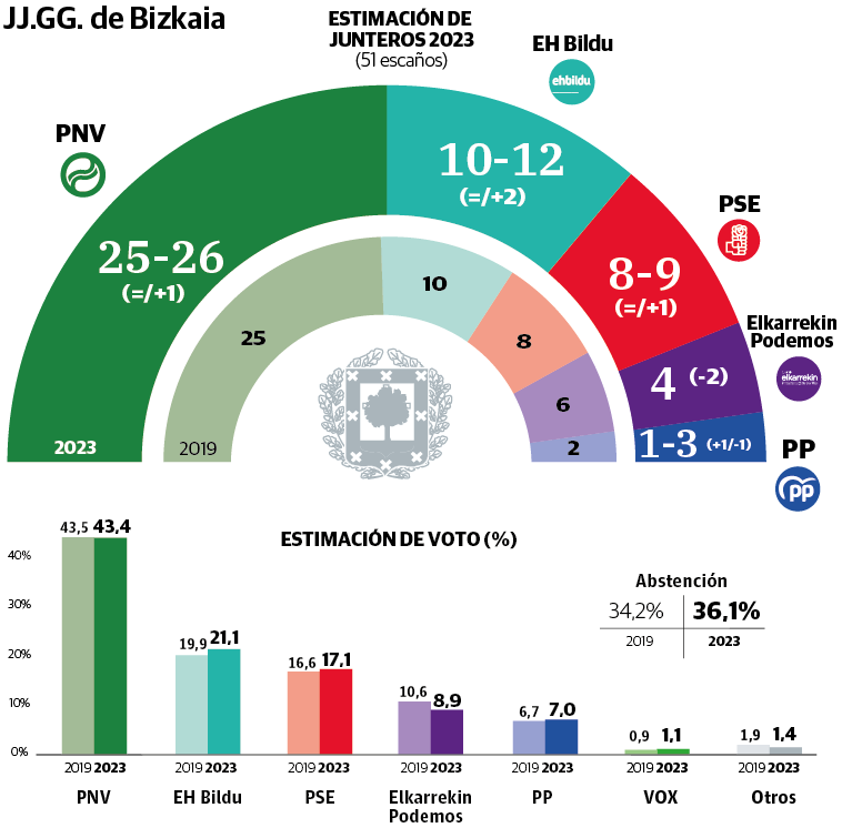 La primera fuerza de la oposición volvería a ser EH Bildu. Los independentistas, que se han fijado el objetivo de penetrar en las grandes urbes del Bilbao metropolitano y de la Margen Izquierda de la mano de su nuevo candidato, Iker Casanova, obtendrían el mejor resultado desde que la coalición concurriera a las urnas forales por primera vez en 2011.