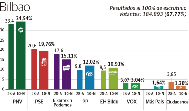 La capital vizcaína volvió ayer a las urnas sin que la fotografía que arrojaron diste mucho de la que ofrecieron los resultados del 28 de abril. Los tres partidos más votados perdieron apoyos a causa de la abstención, que se elevó al 32,2% -siete puntos más que en la anterior cita-. Acudieron 184.893 bilbaínos a los colegios electorales, mientras que el 28-A asistieron 18. 750 más. El PNV, que siempre ha gobernado en la ciudad desde la recuperación de la democracia, sigue ganando por goleada: tuvo menos votantes, 4.092, aunque obtuvo un mayor porcentaje de sufragios válidos, que se elevó al 34,54% del total.