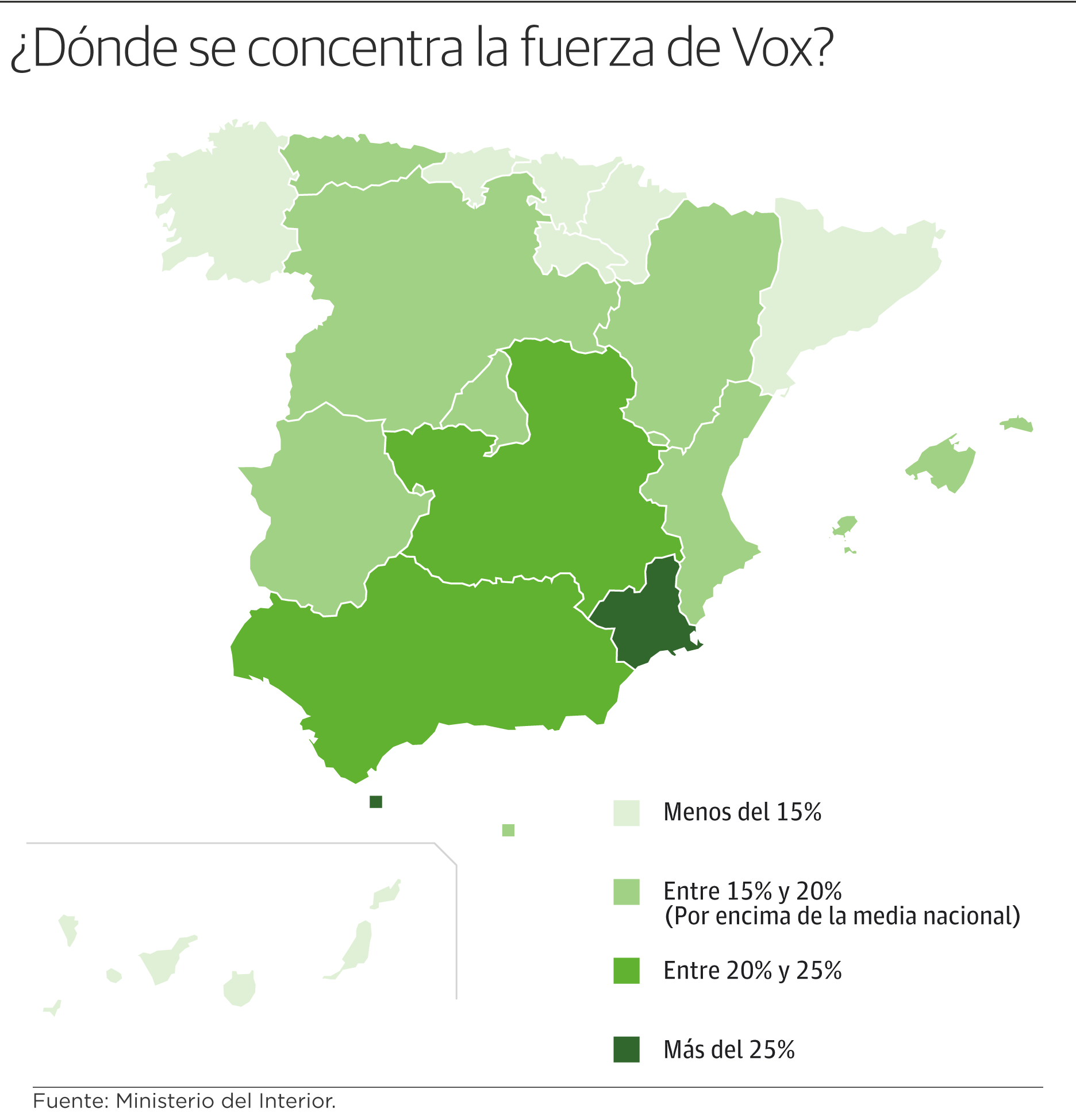 Sin embargo, sus bastiones, los territorios que convirtieron de golpe a la formación de Santiago Abascal –un partido que logró su primer cargo institucional hace solo once meses en los comicios andaluces– en la tercera fuerza política nacional están prácticamente todos ubicados en la mitad sur de España.