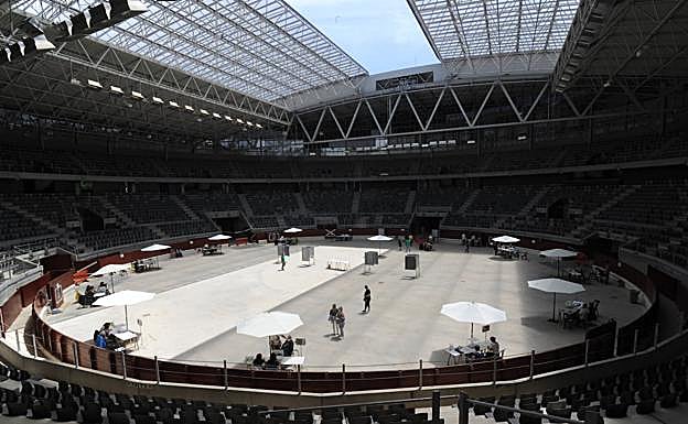 El mulitusos Iradier Arena, antigua plaza de toros de Vitoria, se ha convertido hoy en colegio electoral. Un amplio espacio que, para mejorar las de condiciones de confort de los votantes, ha abierto su cubierta un 30%, una vez que la lluvia y el cielo gris han dejado paso a un mediodía y una tarde agradables.