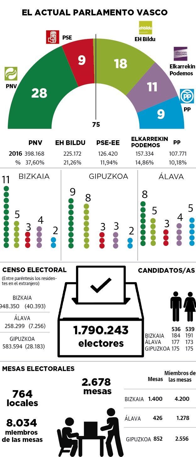 Hoy, 1.790.243 vascos (6.823 más que en la cita de 2016) están llamado a acudir a alguno de los 2.678 locales habilitados para ejercer el voto, 85 más que en 2016. Y todo bajo unas estrictas medidas de seguridad e higiene que eviten los temidos contagios. Mascarilla obligatoria, respetar sí o sí la distancia de seguridad, geles desinfectantes, llevar las papeletas desde casa si es posible, kits sanitarios... Si formar parte de una mesa electoral es una situación difícil de olvidar, el 12-J no tiene precedente con el que compararse. El Gobierno, además, se juega mucho por el temor a que se produzca un brote en algún colegio. Si estos comicios ya vienen marcados por la polémica sobre la fecha de su celebración, un contagio masivo de estas características desataría una nueva tormenta política.