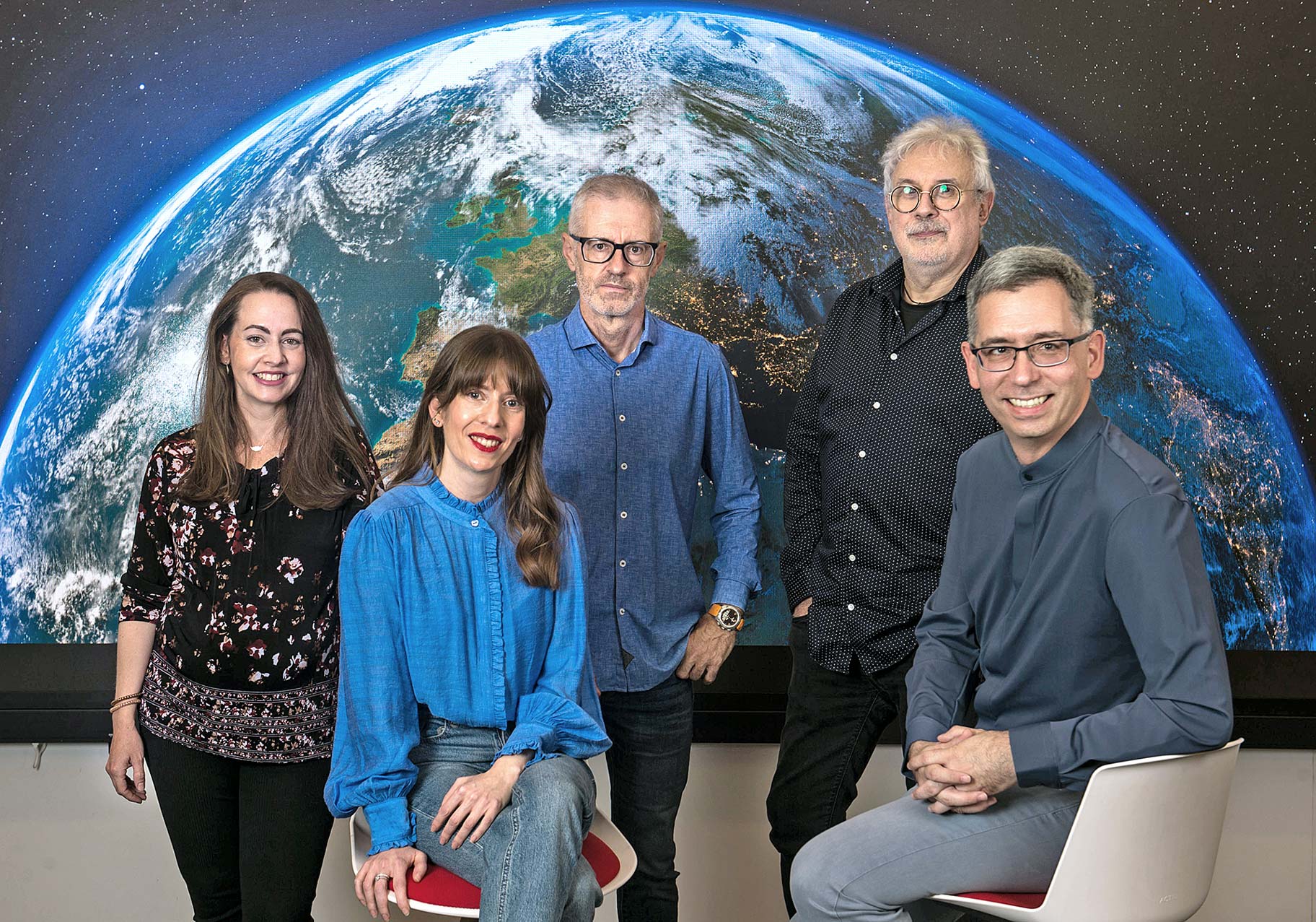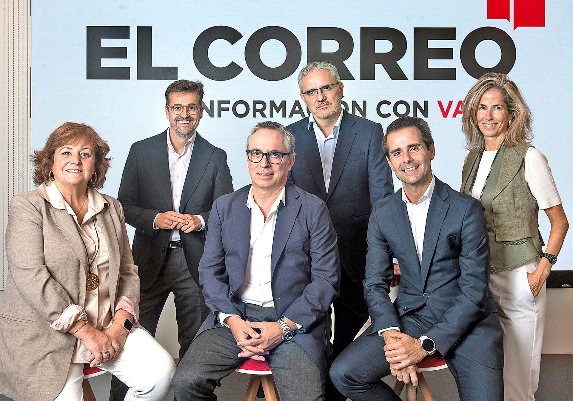 De izquierda a derecha, Carmen Manrique (directora de Negocio), Adolfo Lorente (subdirector), Oscar Villasante (director), Íñigo Barrenechea (director general), Fernando Castiella (director de Recursos Humanos) y Zuriñe Ortiz de Latierro (directora del periódico en Álava).