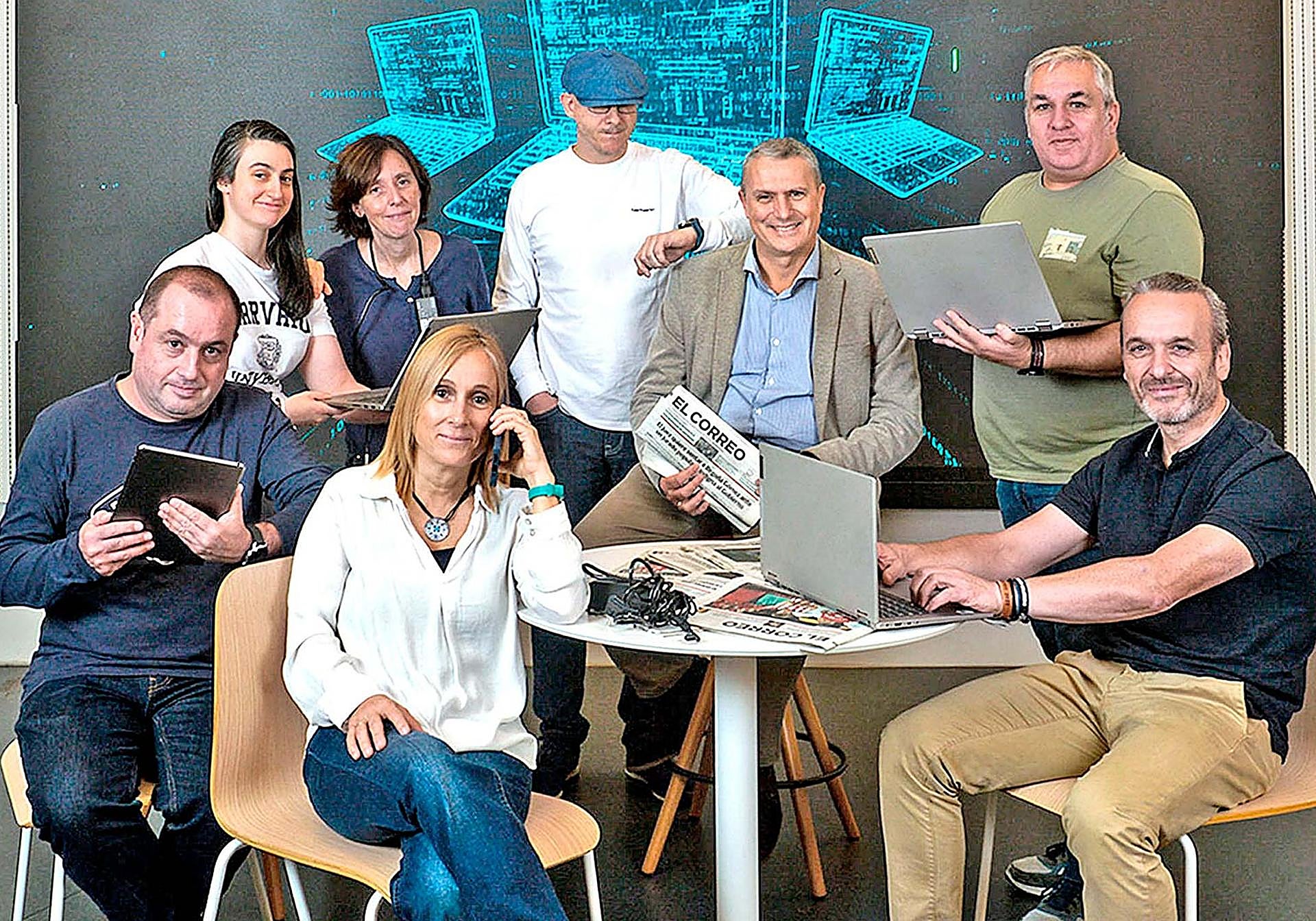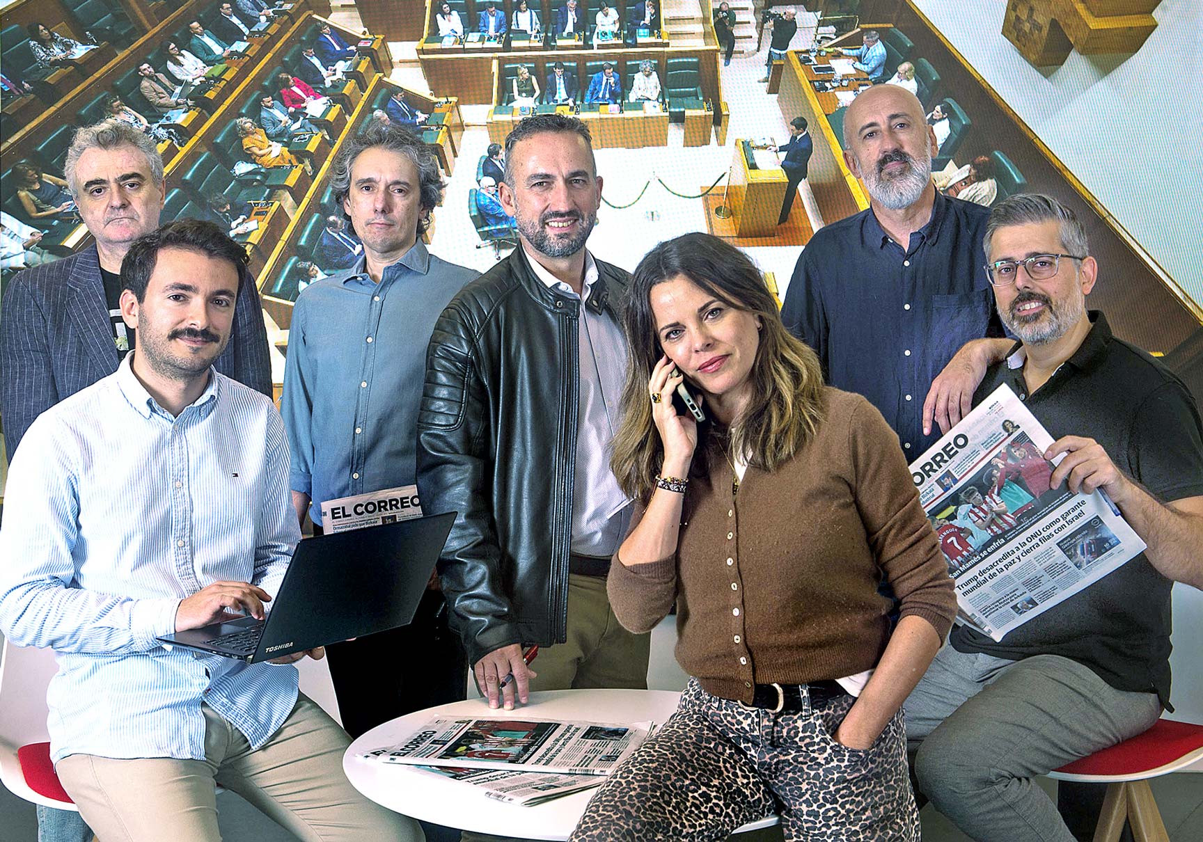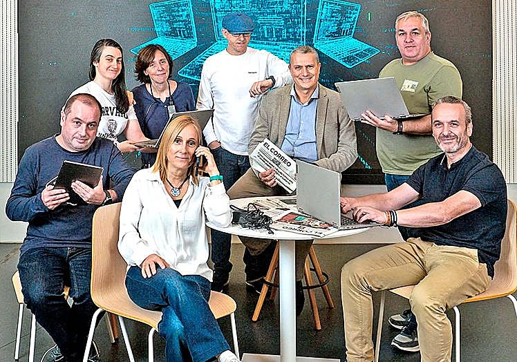 La verdad es que en esta fotografía podrían estar presentes todos los periodistas de EL CORREO. El equipo de la web es el que abre y cierra la persiana porque la información en internet no entiende de horas, lo mismo cubrimos un asesinato en Vitoria que la masacre de Gaza. Somos el primer retén de bomberos en reaccionar cuando prende el fuego, al impacto inicial de las noticias, a la espera de que nuestros compañeros de las diferentes secciones, los corresponsales en el extranjero, los fotógrafos, los infógrafos, los editores de vídeos... completen el sello de calidad en un producto que ya suma 26.000 suscriptores.