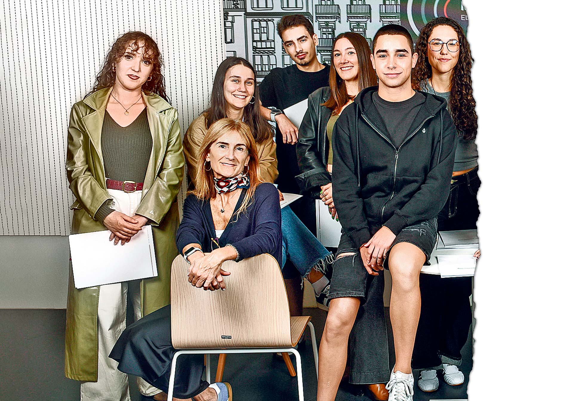 De izquierda a derecha, los alumnos del Máster de este curso: Liselot Verbeke, Alazne Pérez, con Yenofa Arteche (coordinadora), Javier Álamo, Andrea Montes, Iñigo Gómez y Nora Gantes.