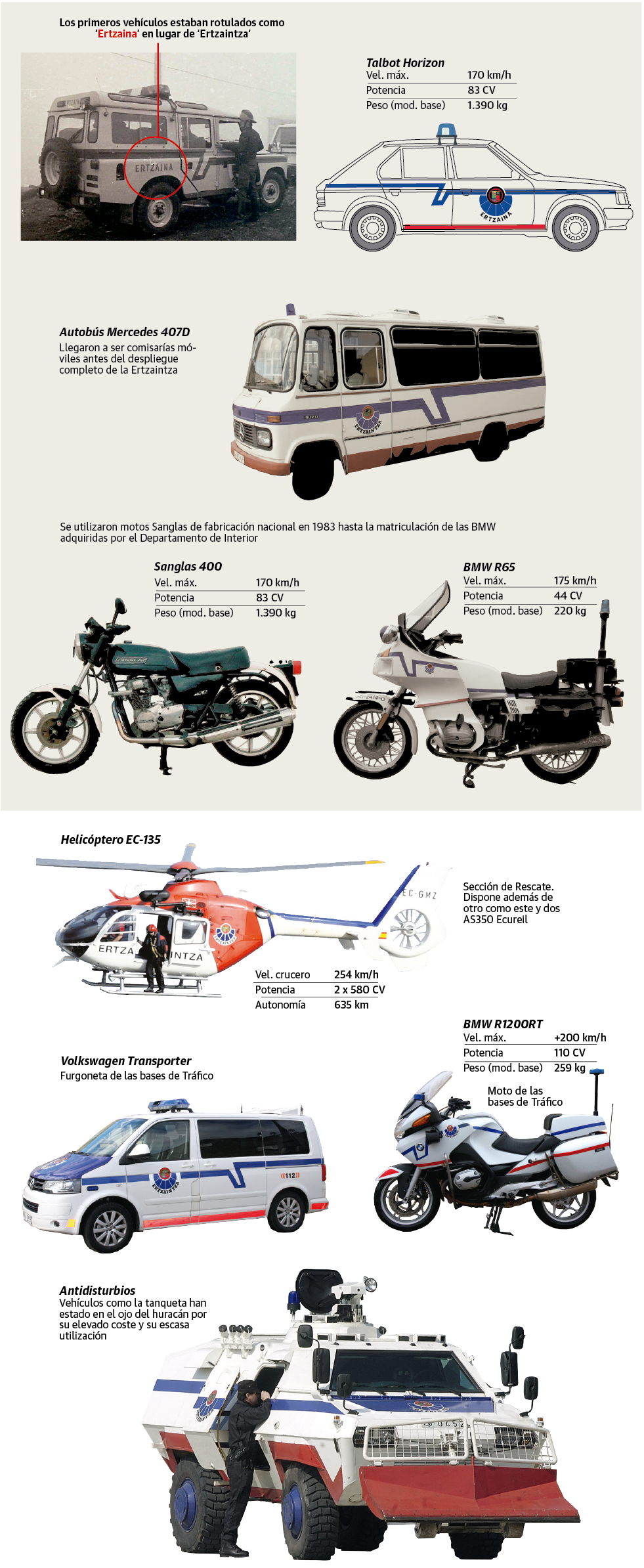 De los viejos Talbot Horizon y las txapelas rojas a los modernos helicópteros y los uniformes ignífugos, así han cambiado los equipamientos policiales a lo largo de cuatro décadasGonzalo de las heras | ISABEL TOLEDO | AINHOA DE LAS HERAS