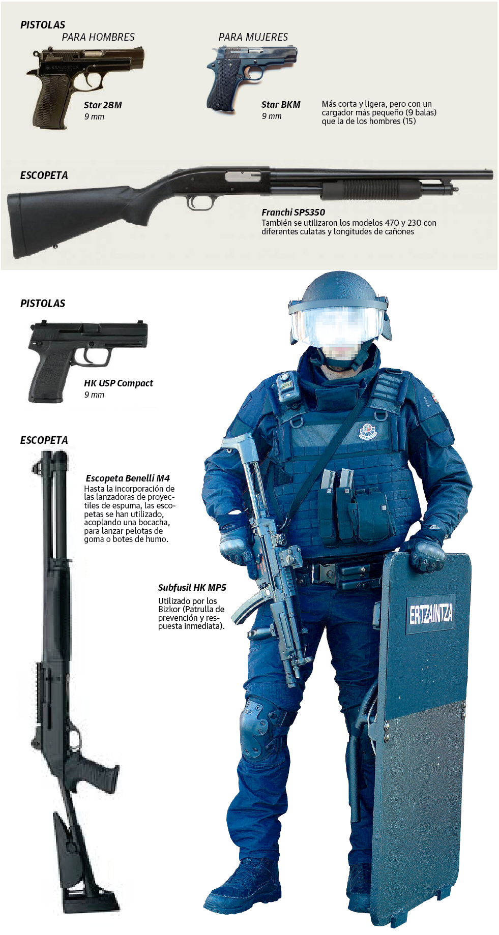 La Ertzaintza se ha mantenido fiel al calibre 9 mm en las armas cortas y al calibre 12 en las escopetas, aunque los modelos han ido variando con el paso de los años. De las primeras Star de fabricación nacional -se han sucedido varios modelos de la marca-, se ha pasado a las pistolas Hekler&Koch de la actualidad.