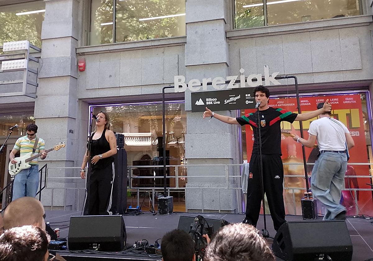 Fue una actuación de una media hora gamberra desde el principio, con un Javier Calvo que ejerció de 'frontman', enfundado con una camiseta con el escudo de Euskal Herria y escoltado por los otros tres miembros de la banda: el músico y actor Álex de Lucas a la guitarra, Elena Rodríguez a las voces y Marco Frías al bajo.