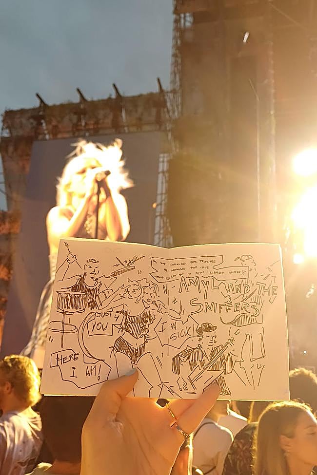 ¿La música que se interpreta influye en el dibujo? O, dicho de otra manera, ¿los trazos bailan? «Cada concierto tiene sus circunstancias y te obliga a adaptar tus herramientas, por supuesto. Jessica Pratt, por ejemplo, me lo puso muy fácil: no se movía, pude ponerme muy cerca y al lado de una valla, un lujo... Pulp, en cambio, fue un jaleo, porque era de noche, estaba muy lejos y tenía que basarme más en las pantallas y la propia energía. En Kneecap todo el mundo bailaba alrededor. Y, por ejemplo, la cantante de Amyl and the Sniffers era muy dinámica, así que lo hice más movido. Además, si dicen alguna frase que me llama la atención, la añado como si fuese un cómic, en una amalgama que intenta reflejar esa personalidad de cada artista».