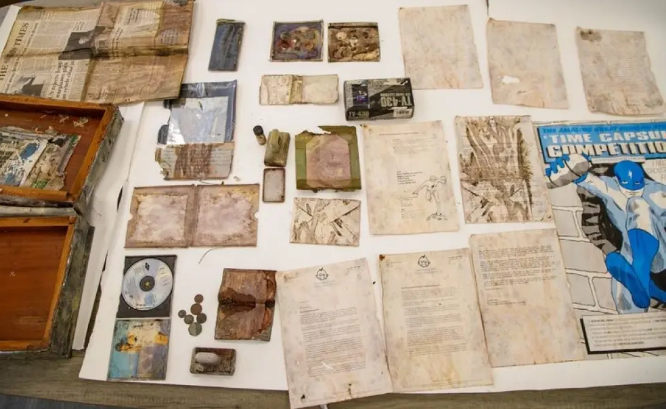 También se encontraron un cómic, un disco de Kylie Minogue, una cámara fotográfica desechable, un ejemplar del periódico británico The Times y otros documentos seleccionados por la princesa junto a los dos niños ganadores de un concurso para participar en la iniciativa. El paso del tiempo, sin embargo, dejó su huella: el hospital descubrió que actualmente no poseen ningún reproductor capaz de leer el CD de la artista.