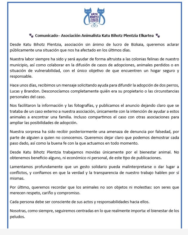 «Nos facilitaron la información y las fotografías, y publicamos el anuncio dejando claro que se trataba de un caso externo a nuestra asociación, únicamente con la intención de ayudar a estos animales a encontrar una familia», añade. Pero para su sorpresa, la asociación ha recibido «una amenaza de denuncia por falsedad por parte de alguien a quien no conocemos». Los miembros de 'Katu Bihotz Plentzia Elkartea' insisten en que pueden «demostrar cada paso dado, así como la buena fe con la que actuamos en todo momento» y recuerdan que «no obtenemos beneficio alguno, ni económico ni personal, de este tipo de publicaciones».