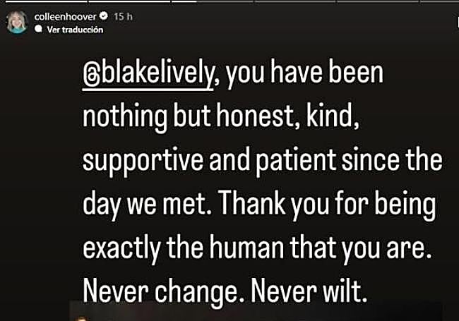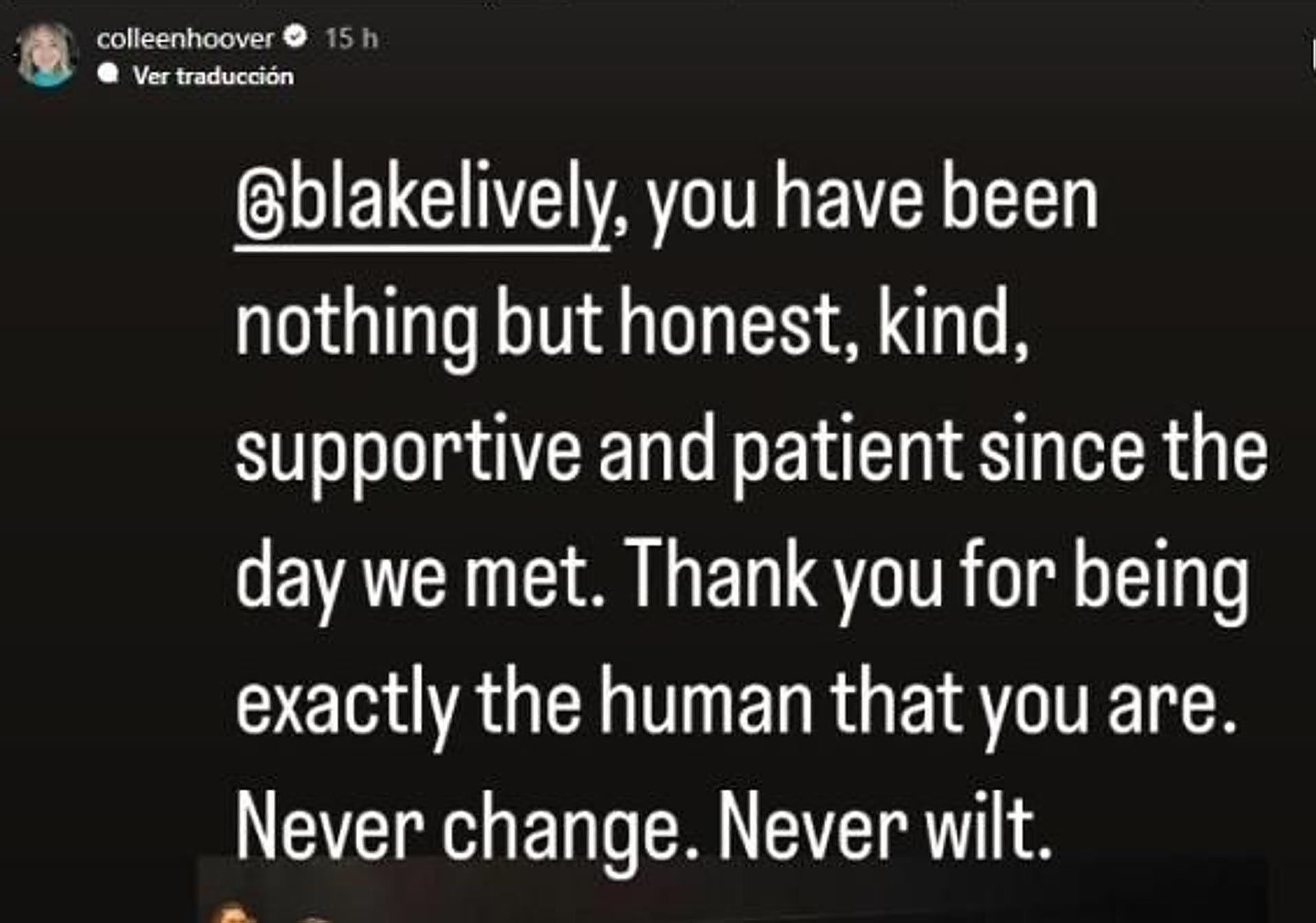 Una de las primeras en hacerlo fue Colleen Hoover, autora de la novela en la que se basa la película en la que se generó el conflicto entre los protagonistas. La escritora utilizó sus redes sociales para manifestar su apoyo, publicando una foto de Blake y escribiendo: «Gracias por ser exactamente el ser humano que eres. Nunca cambies. Nunca te marchites».