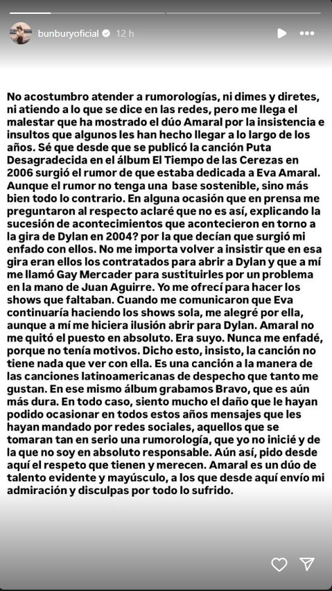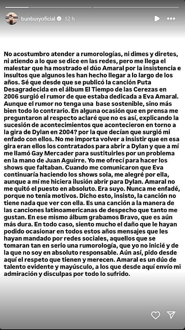 «No acostumbro atender a rumorologías ni a lo que se dice en las redes, pero me llega el malestar que ha mostrado el dúo Amaral por la insistencia e insultos que algunos les han hecho llegar a lo largo de los años«. Así ha roto Enrique Bunbury su silencio tras la reacción de los zaragozanos, hartos de que después de más de 20 años haya todavía quienes afirmen que la canción 'Puta Desagradecida' (2006) de Bunbury está dedicada a Eva. »Creemos que es hora de que se cuente la verdad y de paso de que sus seguidores nos dejen en paz», escribieron en el perfil oficial de Amaral en X (antes Twitter).