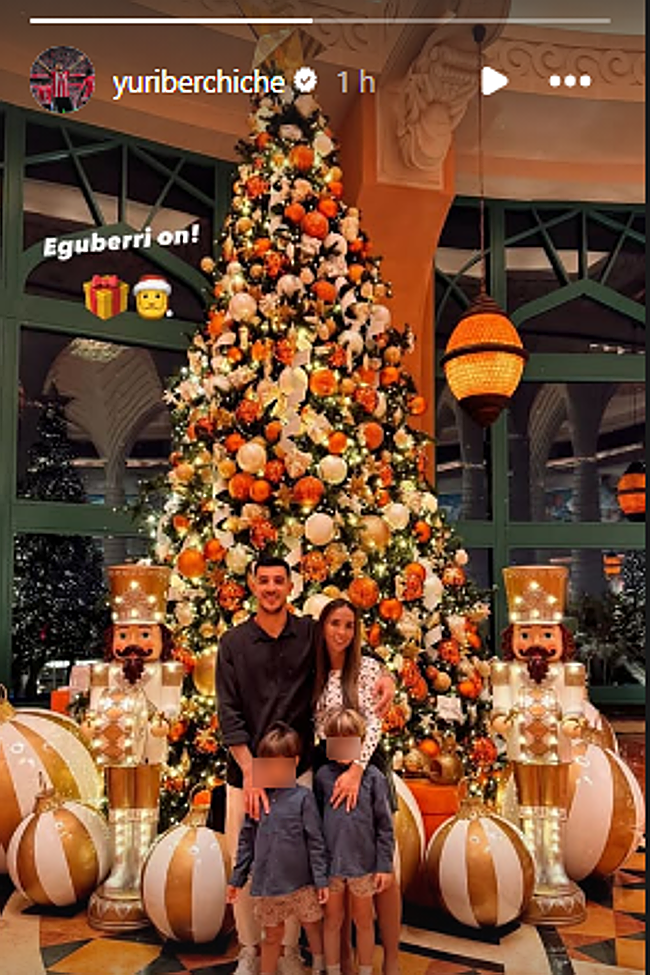 Yuri Berchiche, su mujer y su dos hijos han posado junto a un espectacular árbol de Navidad en una imagen que el futbolista del Athletic ha compartido en su perfil de Instagram.