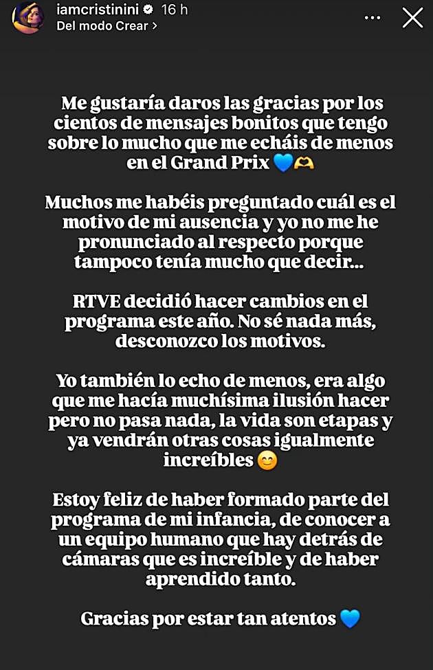 Cristinini ha explicado que «RTVE decidió hacer cambios en el programa este año». «No sé nada más, desconozco los motivos. Yo también lo echo de menos, era algo que me hacía muchísima ilusión hacer, pero no pasa nada. La vida son etapas y ya vendrán otras cosas igualmente increíbles», zanjaba.