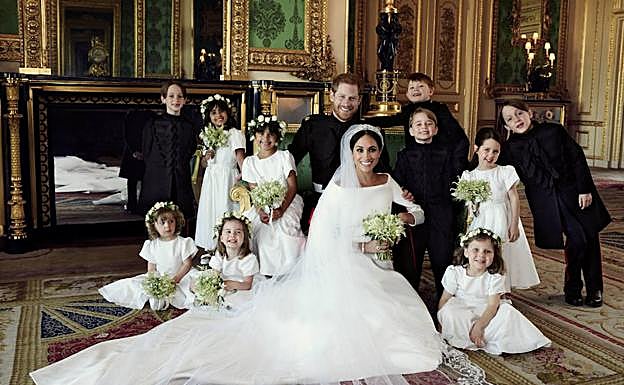 En otro de los retratos divulgados hoy se puede ver a los duques de Sussex en uno de los salones del castillo de Windsor, rodeados de los diez niños que ejercieron de pajes y damas de honor en la ceremonia, entre ellos el príncipe Jorge, de cuatro años, y la princesa Carlota, de tres, hijos de los duques de Cambridge.