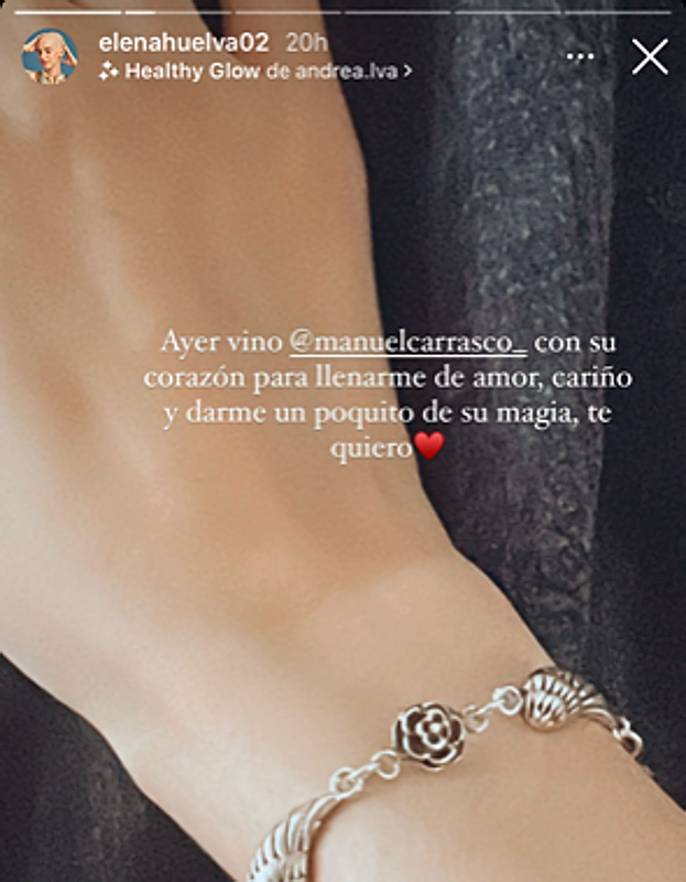 El cantante conoce a la influencer desde hace años y, desde entonces, siempre está cerca de ella para mostrarle todo su apoyo en su lucha contra la enfermedad. Una de sus canciones, 'la mujer de las mil batallas', es una obra dedicada a su amiga. Huelva, muy emocionada, hizo partícipe ayer a sus seguidores del regalo que le había hecho Carrasco: una pulsera con alas y rosas con un enorme significado para ella. «Vino con su corazón para llenarme de amor, cariño y darme un poquito de su magia, te quiero», le escribió la influencer en Instagram. Él hizo lo propio y respondió con un «te quiero, mi niña» y un corazón.