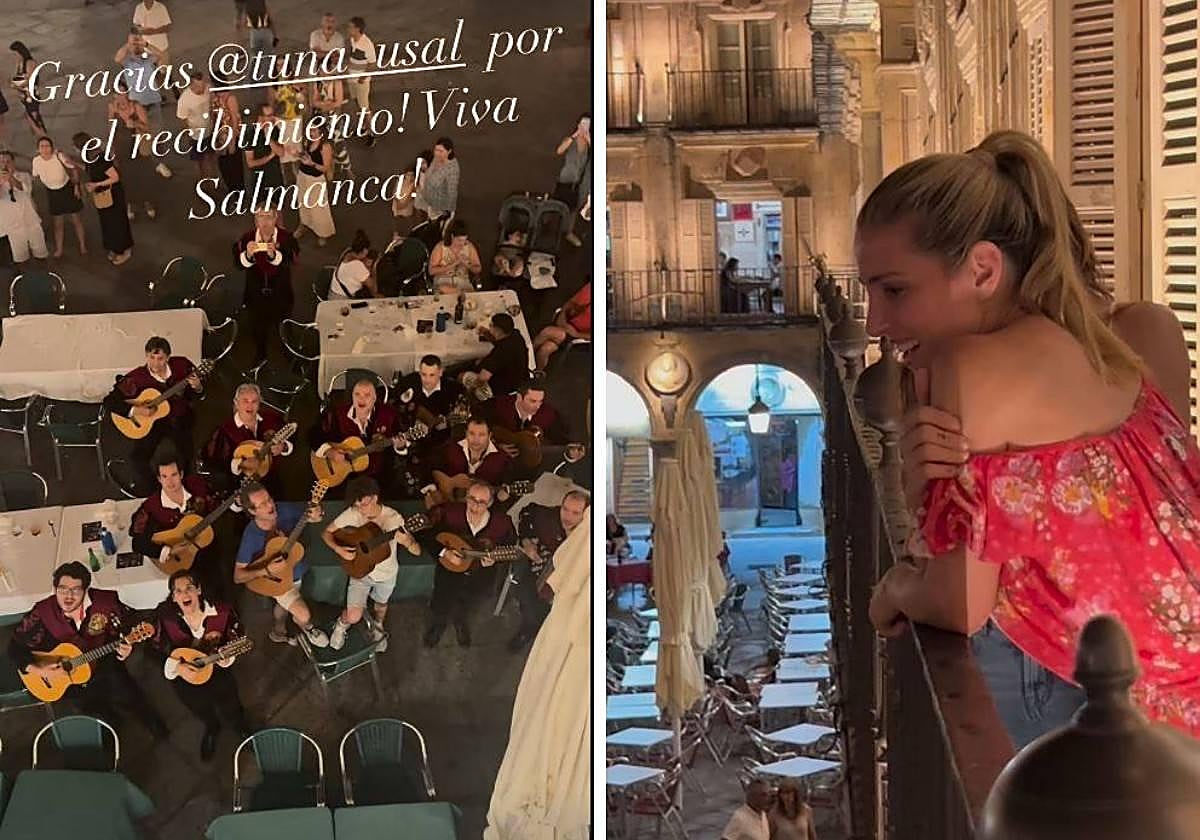 «Gracias por el recibimiento. Viva Salamanca», escribe la actriz en su perfil de Instagram. «¿Qué tenéis allí abajo?», pregunta Maxi Iglesias, a lo que ella responde entre risas: «¡A la tuna rondando!». Con humor, el actor aseguró que «a nosotros no nos ronda nada, pero a ellas sí», haciendo alusión al grupo de músicos que se había concentrado en el balcón de las mujeres.