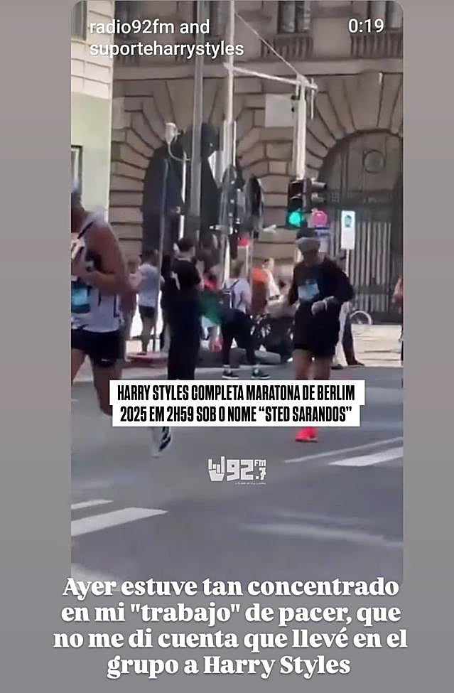«Ayer estuve tan concentrado en mi trabajo de 'pacer' que no me di cuenta que llevé en el grupo a Harry Styles», compartía con sus más de 4.500 seguidores junto a un vídeo en el que se veía a ambos en el grupo. Vamos, que no pudo ni pedirle una foto a cambio del 'favor'. Hasta la propia organización del maratón de Berín presumió de la presencia del que fuera integrante de 'One Direction'. «Se rumorea que Harry Styles corrió un maratón sub-3 en Berlín... ¿Alguien ha oído hablar de ello?», publicaba en sus redes.