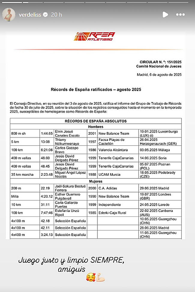 Ahora, la Real Federación Española de Atletismo ha confirmado que el récord está en posesión de Verdeliss. La influencer ha compartido en redes el documento oficial que lo acredita. Lo ha subido en una 'story' junto a la frase: «Juego justo y limpio siempre».