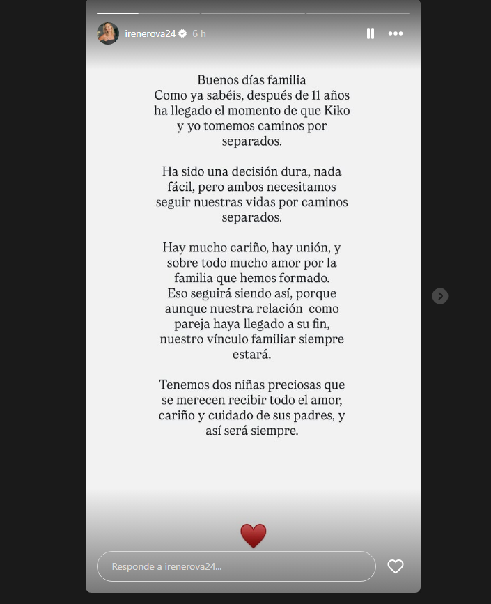 Irene, en la misma línea que Kiko, ha contado que «hay mucho cariño, hay unión y, sobre todo, mucho amor por la familia que han formado». Y ha expresado su deseo de que siga siendo así. «Porque aunque nuestra relación como pareja haya llegado a su fin, nuestro vínculo familiar siempre estará». Irene y Kiko son padres de niñas de 7 y 9 años y aseguran que ellas «se merecen recibir todo el amor, cariño y cuidado de sus padres» y que «así será siempre».