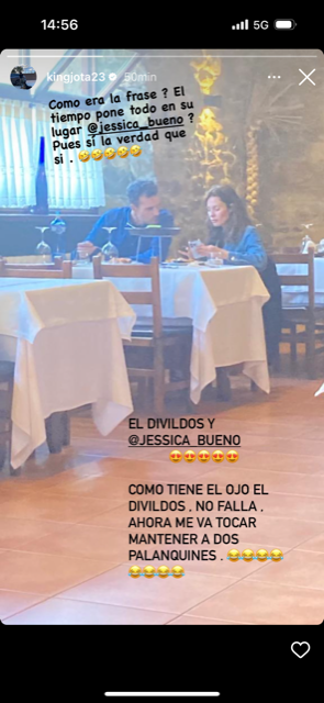 Desde que anunciasen su divorcio, Jota Peleteiro y Jessica Bueno viven inmersos en una guerra personal que este domingo ha sumado un nuevo capítulo. El exfutbolista del Alavés, entre otros clubes, ha publicado una imagen en su Instagram donde se puede ver a Jessica cenando junto a un hombre que, según deduce Jota, sería su pareja. Si ya de por sí es llamativa la publicación, más aún lo son las palabras escogidas por él para definir el momento: «Cómo tiene el ojo el Divildos. No falla. Ahora me va a tocar mantener a dos palanquines». Al texto le acompañan una decena de emoticonos de carcajadas.