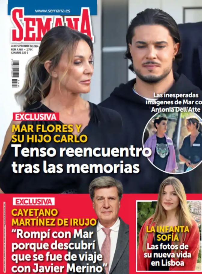 La revista 'Semana' desvela en su edición de este miércoles que la relación entre Mar Flores y su hijo Carlo Costanzia vuelve a ser distante. Este medio aporta un reportaje fotográfico del «tenso reencuentro» de ambos tras la publicación de la autobiografía, donde Carlo hijo asume sin querer un papel protagonista.