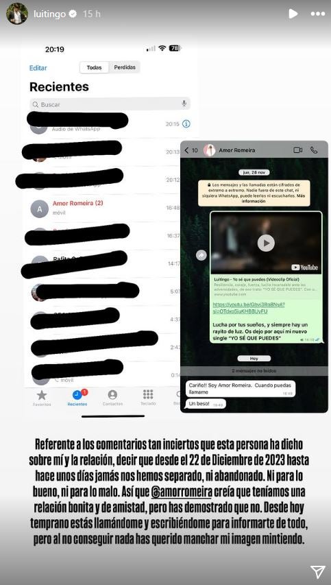 Estas últimas acusaciones no gustaron nada a Luitingo que, tras publicar el comunicado de ruptura, no dudó en atacar a Romeira: «Desde el 22 de diciembre de 2023 hasta hace unos días, jamás nos hemos separado ni abandonado. Ni para lo bueno, ni para lo malo. Amor Romeira creía que teníamos una relación bonita y de amistad, pero has demostrado que no».