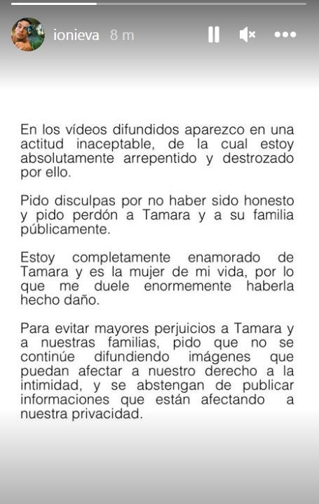 Después de pasar el sábado separados, el domingo el ingeniero cambiaba de postura y optaba por disculparse a ojos del mundo, como pública había sido la afrenta: «En los vídeos aparezco en una actitud inaceptable, de la cual estoy absolutamente arrepentido y destrozado por ello. Pido disculpas por no haber sido honesto y pido perdón a Tamara y a su familia públicamente. Estoy completamente enamorado de Tamara y es la mujer de mi vida, por lo que me duele enormemente haberle hecho daño. Para evitar mayores perjuicios a Tamara y a nuestras familias, pido que no se continúe difundiendo imágenes que puedan afectar a nuestro derecho a la intimidad y se abstengan de publicar informaciones que están afectando a nuestra privacidad», escribía en sus stories de Instagram.