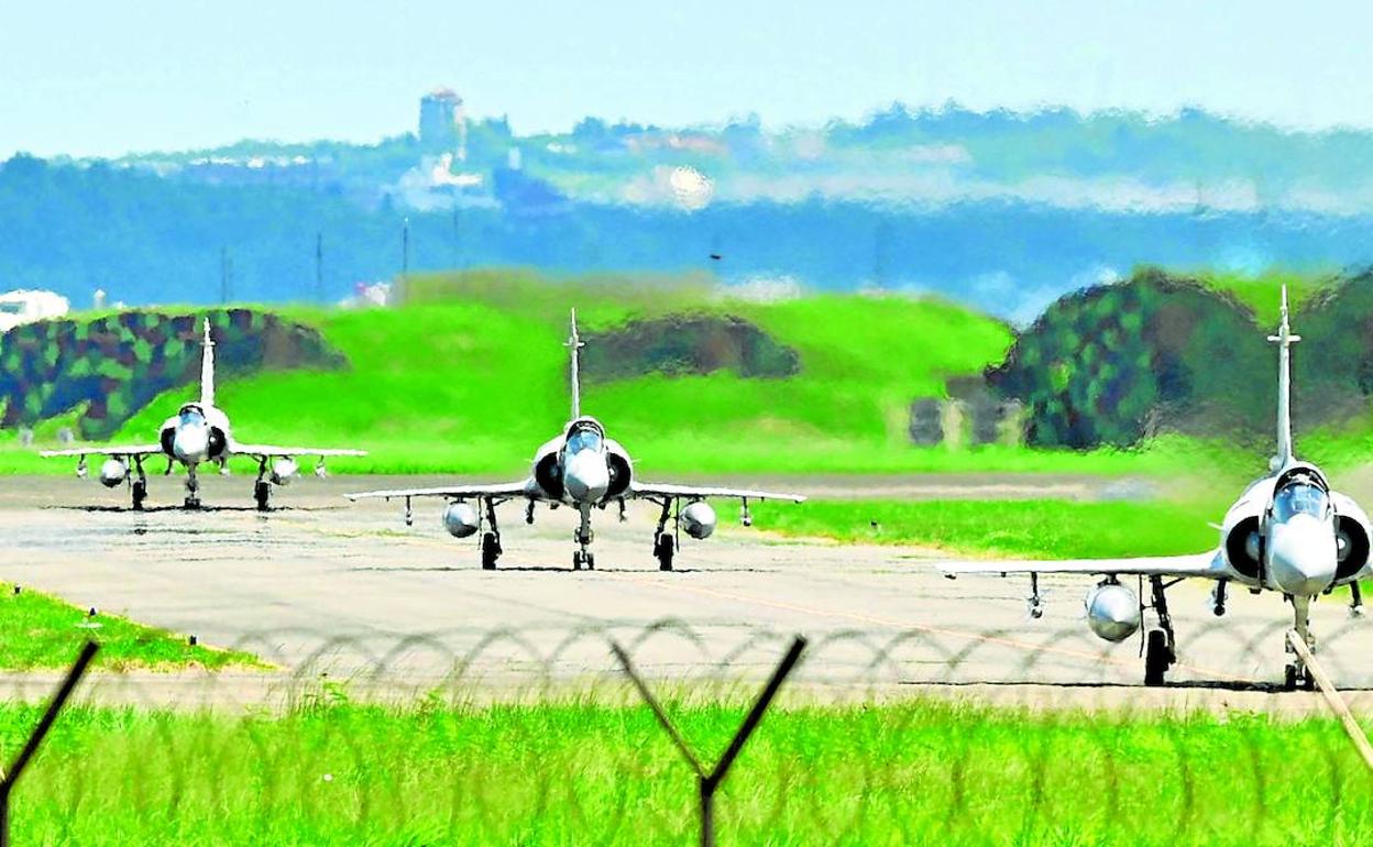 Tres aviones de combate ruedan por una pista en la base aérea de Hsinchu. AFP