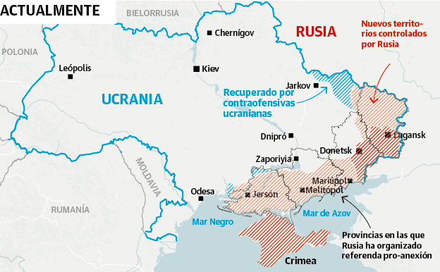 ¿Supone este giro el anticipo de una derrota definitiva de los invasores? Nadie lo sabe, pero siguiendo las predicciones de los analistas y la cautela de EE UU, resulta aún quimérico. Si bien estos cambios de control territorial son importantes para establecer posiciones de fuerza y mantener alta la moral de la tropa, todavía son muy reducidos respecto al área de exclusión total y quedan al albur de contragolpes. En realidad es más importante el equilibrio de fuerzas entre los dos ejércitos, dicen los estrategas. Si las capacidades de ambos se igualan, cabe una pausa de aquí a finales de año para consolidarse y rearmarse, sobre todo cuando Putin y Zelenski se han ocupado de cerrar el camino a una vía diplomática; el primero con el decreto de anexiones y el segundo con la orden ratificada ayer de no sentarse a una mesa de negociación.