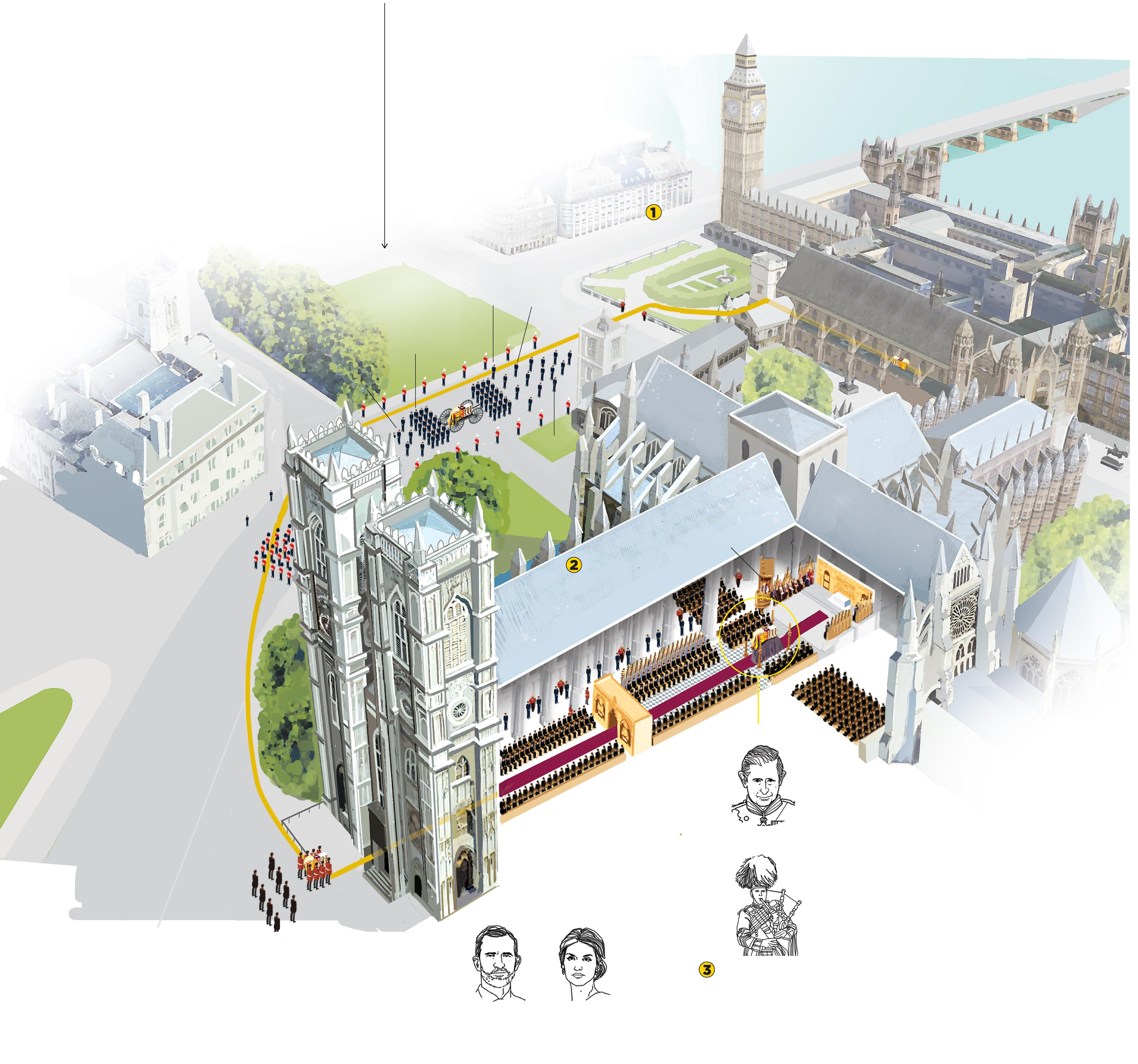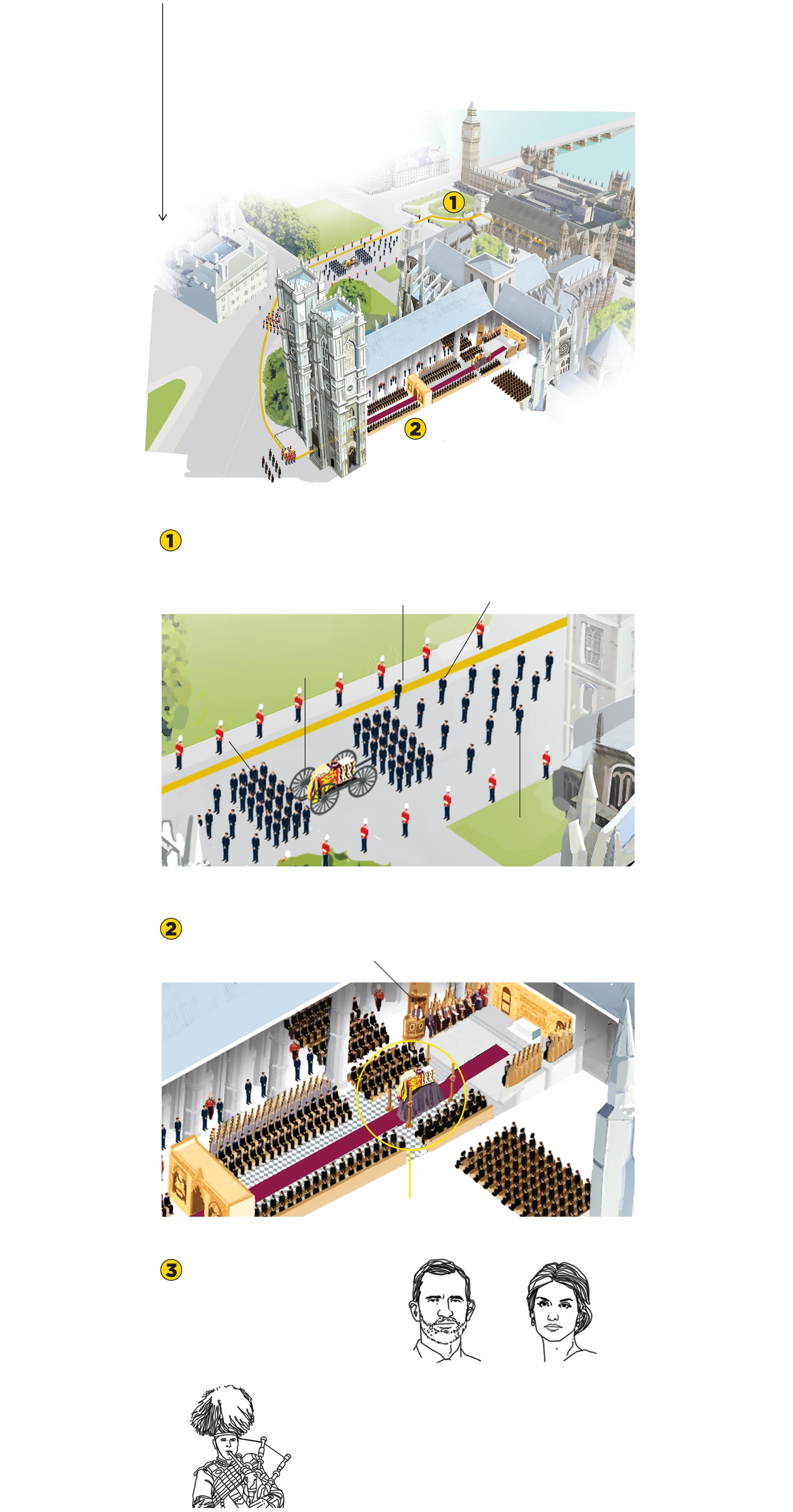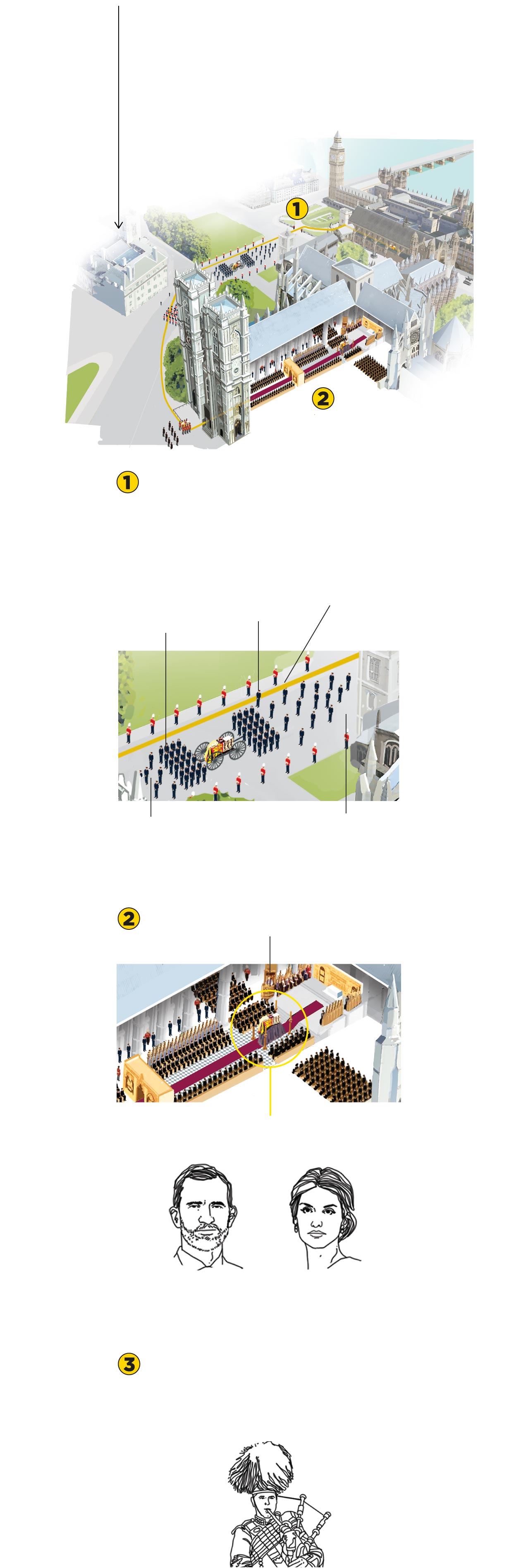 Se espera la presencia de más de 2.200 invitados, entre los que destacan 500 jefes de estado y dignatarios. Los asistentes comenzarán a entrar a la abadía a las nueve de la mañana. Los jefes de estado se reunirán previamente en el Royal Hospital, en el barrio de Chelsea, desde donde irán juntos. El presidente de Estados Unidos y su mujer serán de los pocos que no acceden en el transporte comunitario.