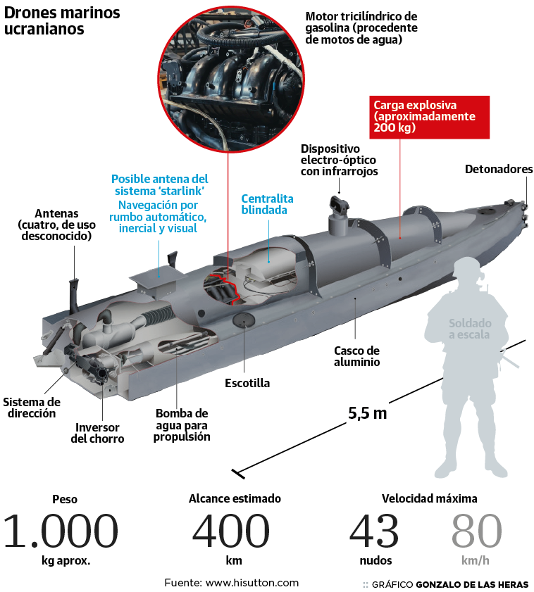 Los rusos consiguieron hacerse con uno de estos inventos y descubrieron que el aparato que ponía en jaque su control sobre Crimea era un bote relativamente simple. A partir del motor de una moto de agua, los ingenieros ucranianos le habían colocado una antena del Starlink -el sistema de internet por satélite de Elon Musk- para poder manejarlo a distancia y un sistema de visión nocturna para poder conducirlo tras la puesta del sol. Y luego lo habían cargado de explosivos. Pese a su sencillez y escaso coste, eran capaces de hundir buques de guerra valorados en millones de euros y con tripulaciones adiestradas.