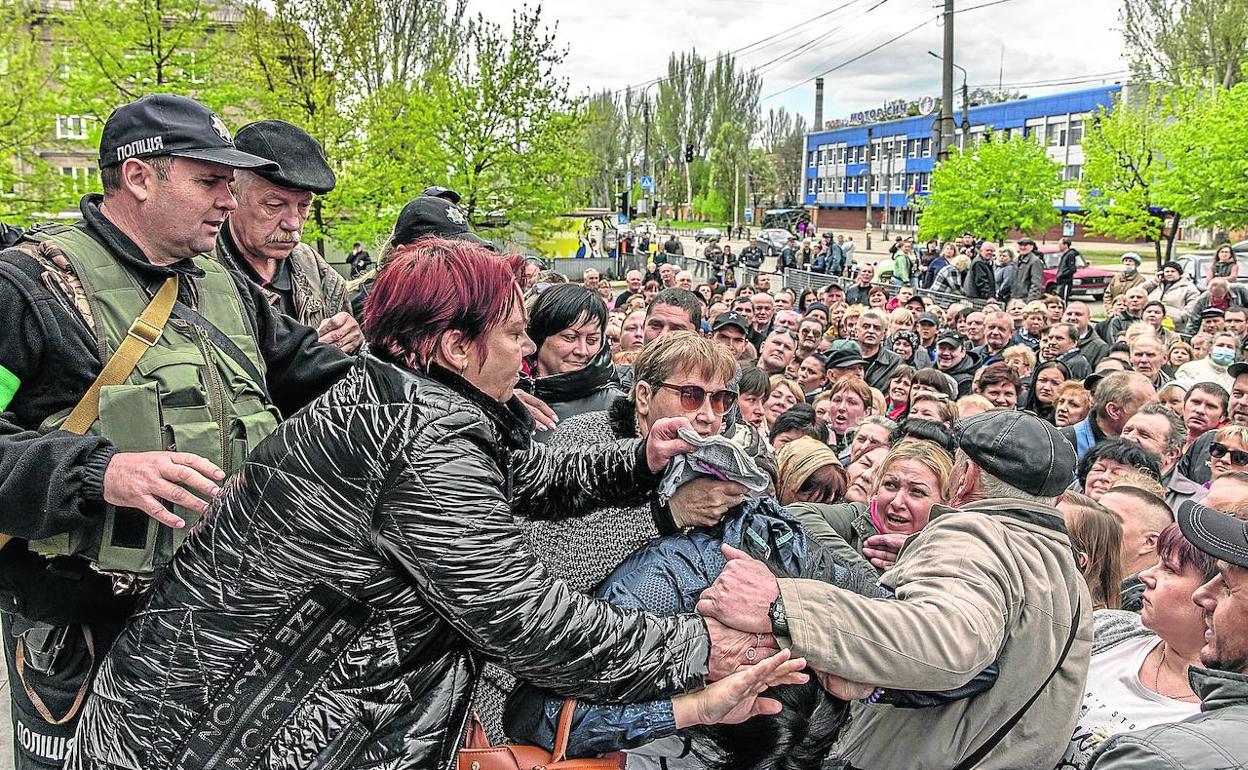 Cientos de familias se agolpan ante un puesto de control de Zaporiyia para recibir ayuda humanitaria. r. pilipey / efe