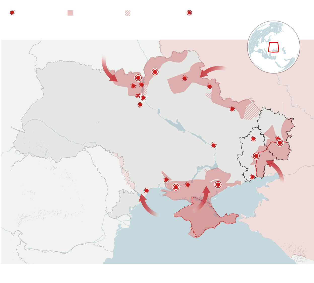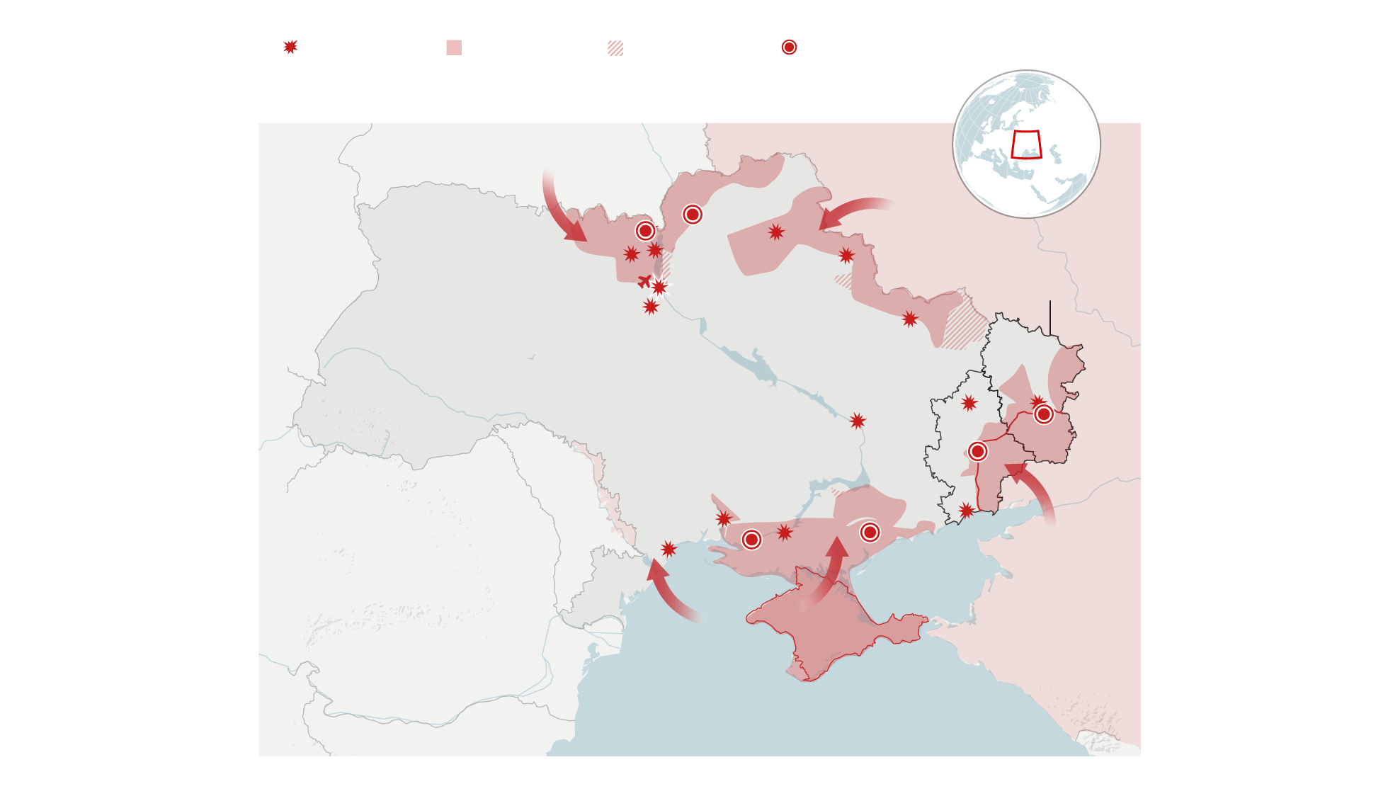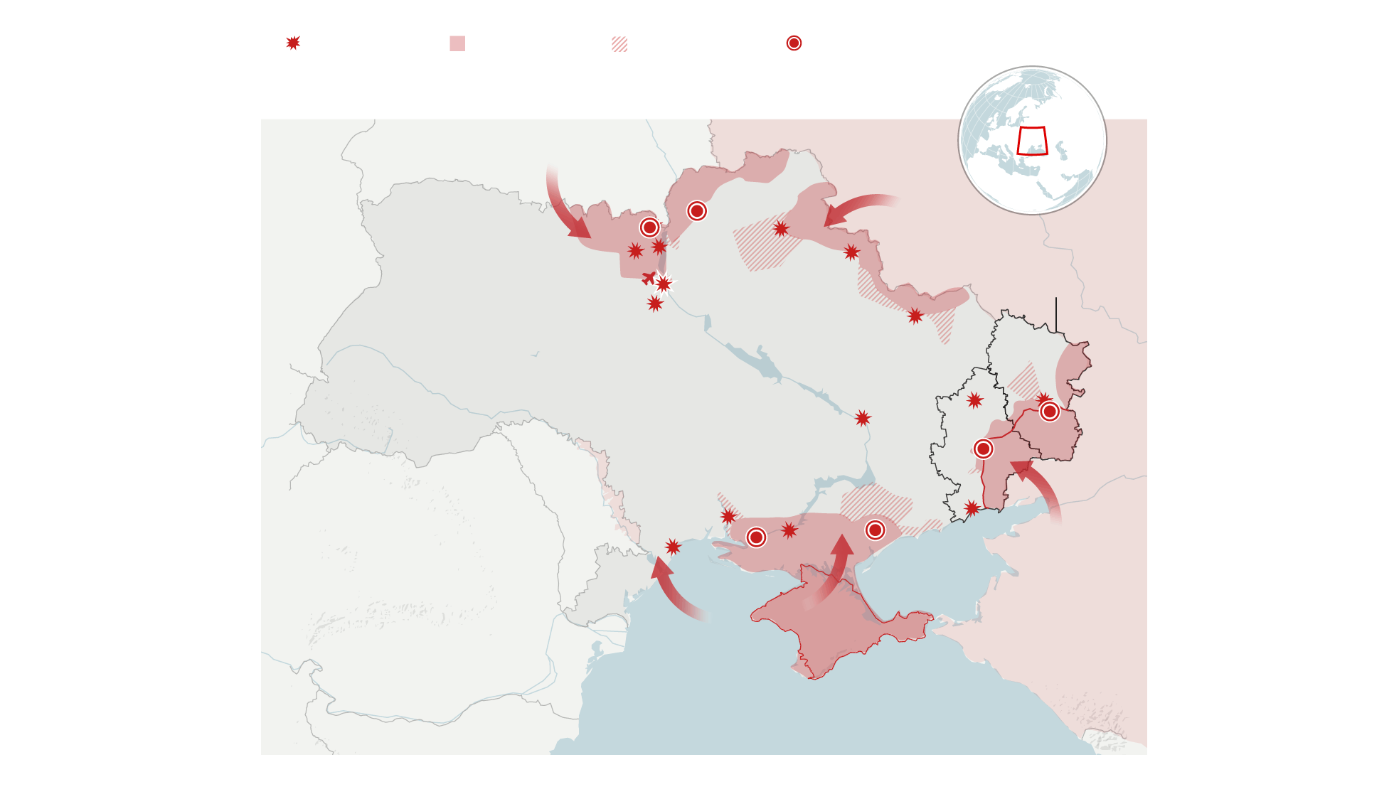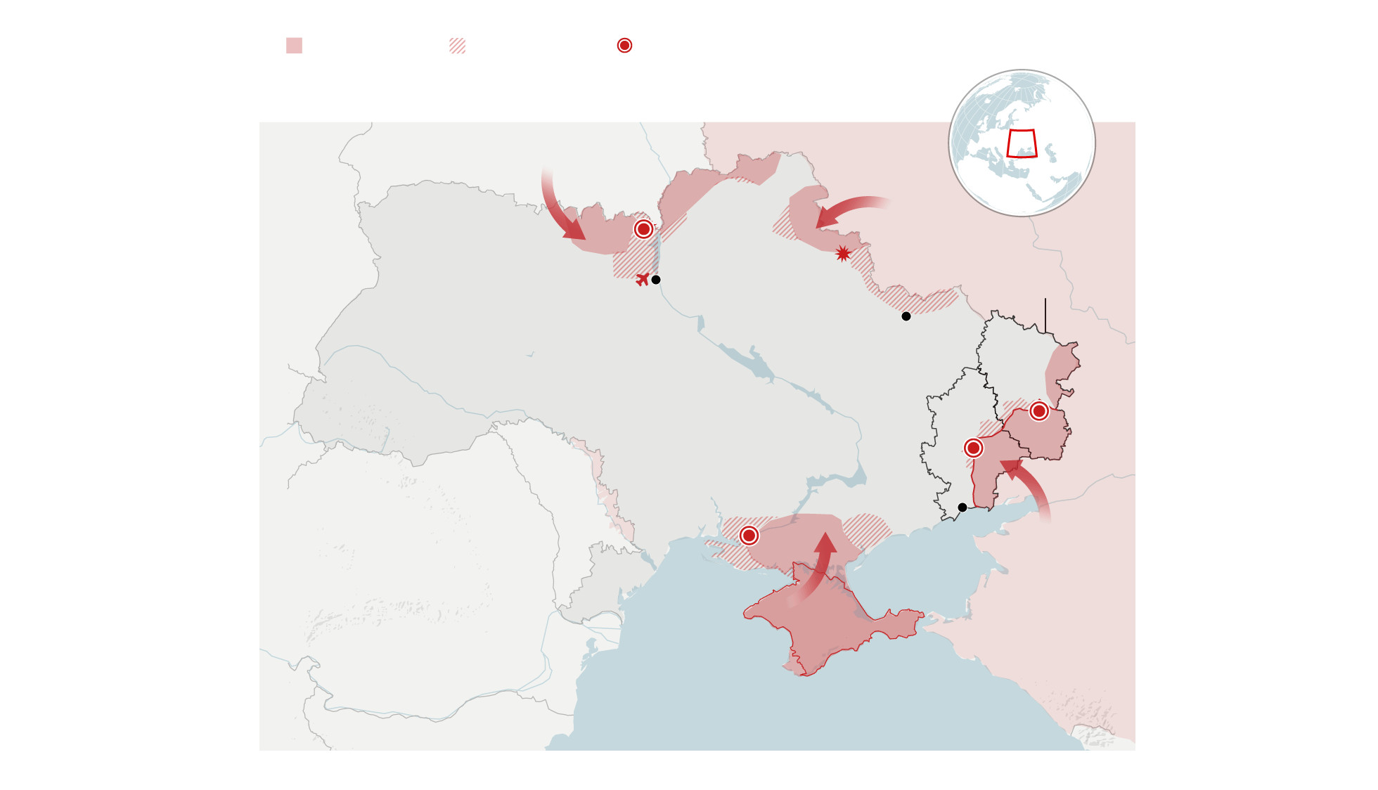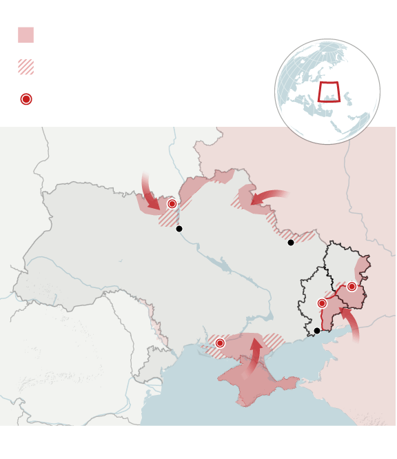 Hay cuatro ejes diferenciados de abordaje: por el sur, desde Crimea, la península que Rusia invadió y anexionó en 2014, hacia Jersón; por el este, por el Donbáss, la zona prorrusa; por el noreste hacia Járkov y por el norte, a través de Bielorrusia y hacia Kiev.
