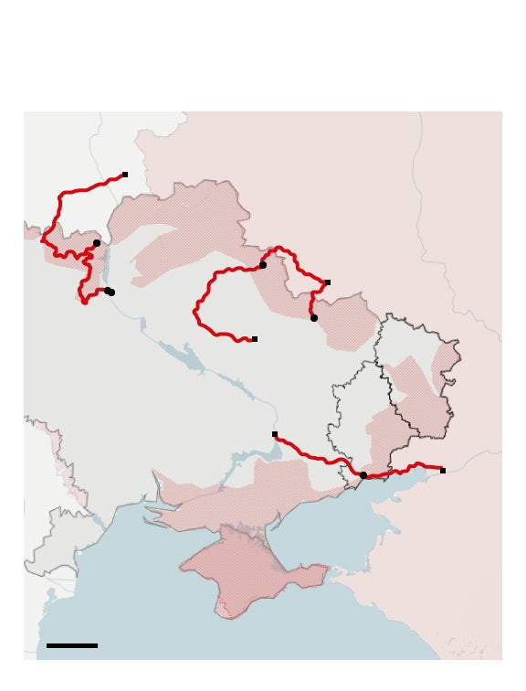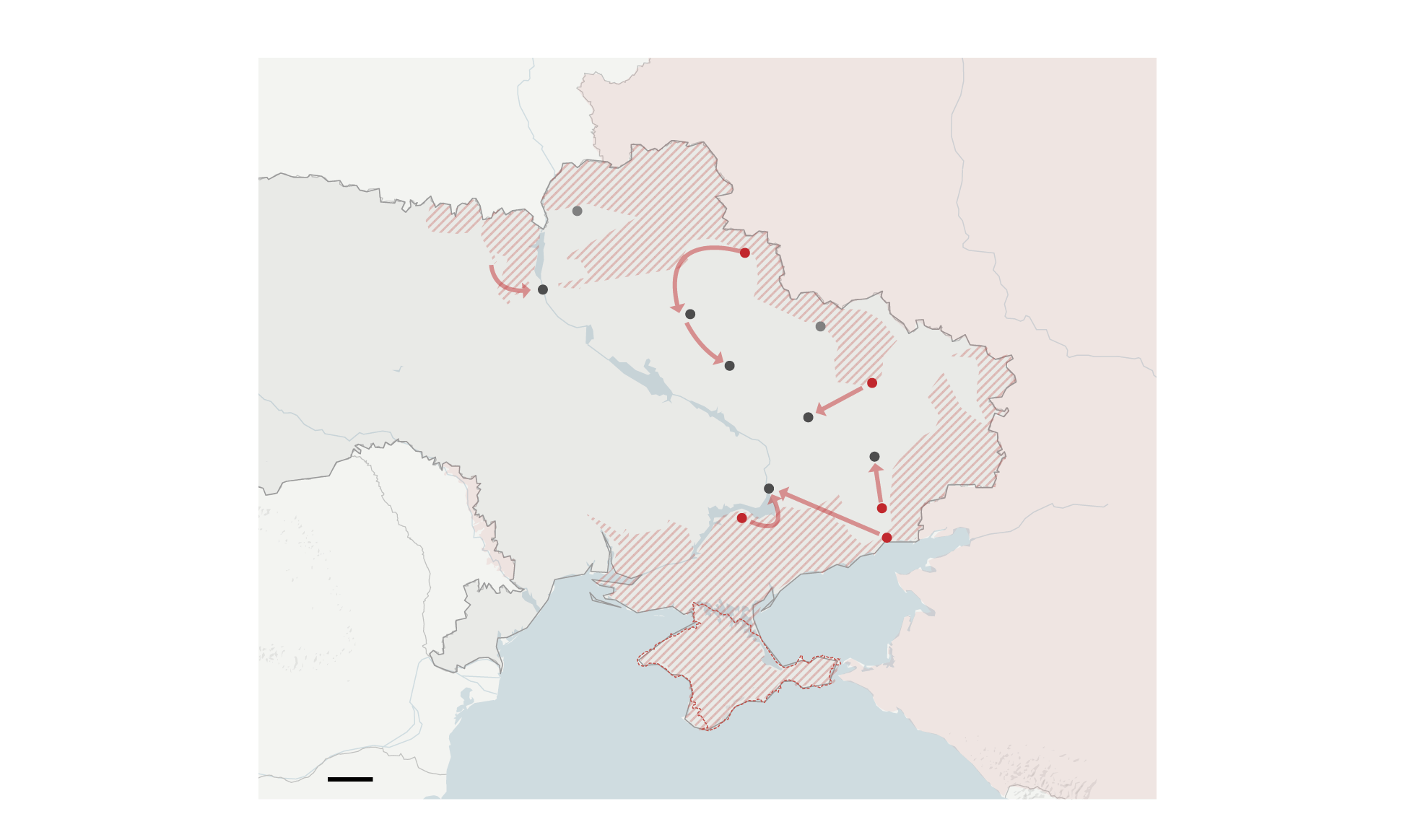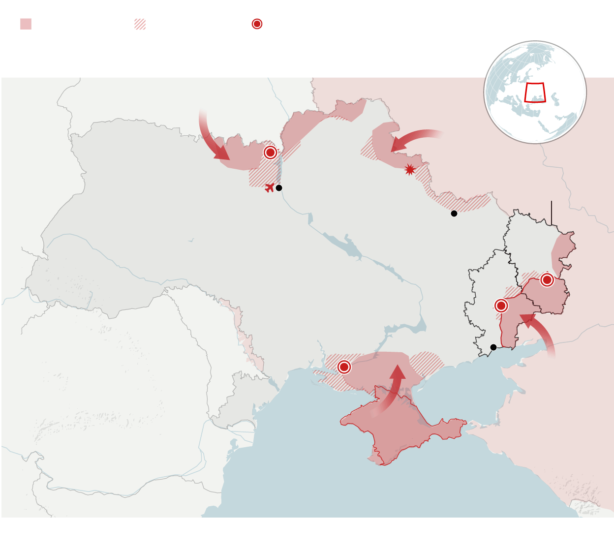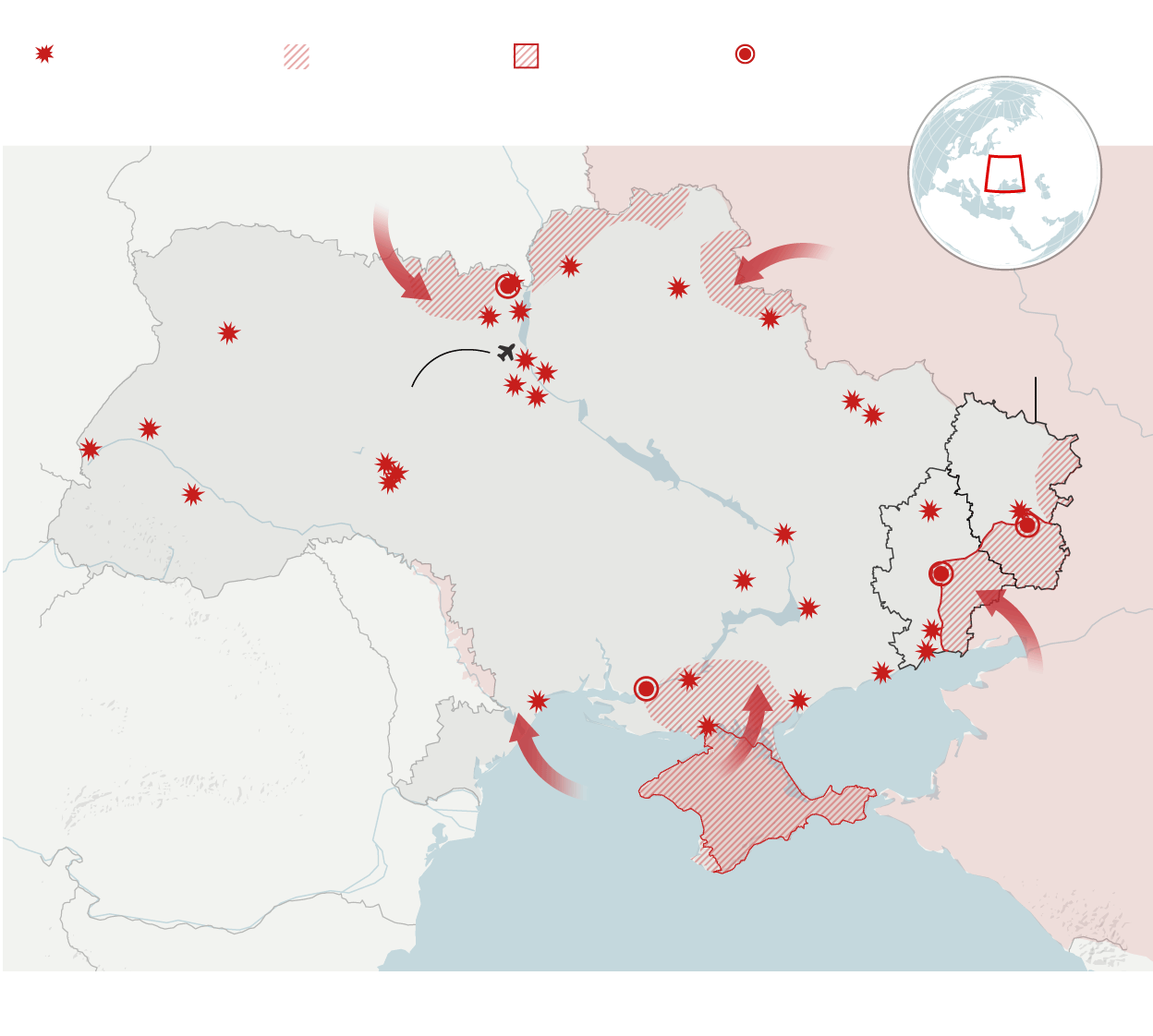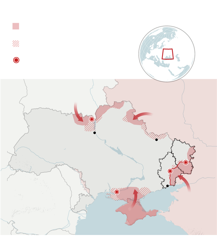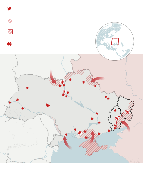 Hay cuatro ejes diferenciados de abordaje: por el sur, desde Crimea, la península que Rusia invadió y anexionó en 2014, hacia Jersón; por el este, por el Donbáss, la zona prorrusa; por el noreste hacia Járkov y por el norte, a través de Bielorrusia y hacia Kiev.