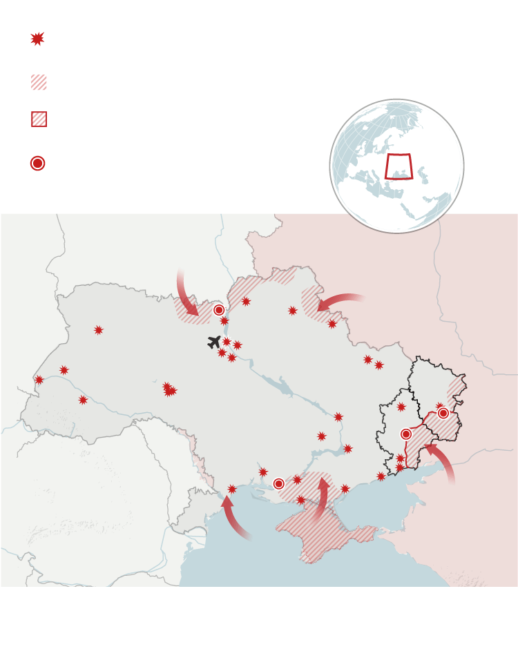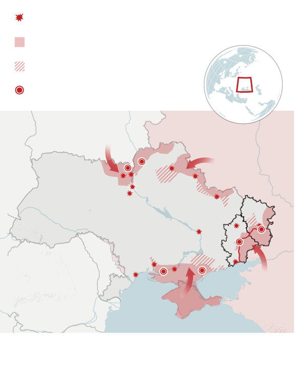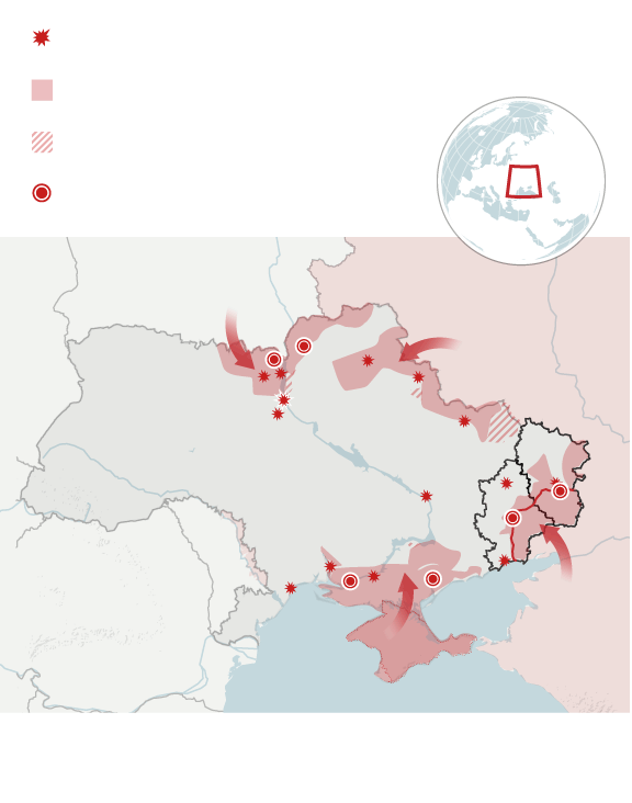 En el escenario actual, las tropas rusas abordan Ucrania desde cuatro puntos: por el sur, desde Crimea, por el este, por el Donbáss, por el noreste hacia Járkov y por el norte, a través de Bielorrusia y hacia Kiev, donde ahora se centra la atención. El objetivo es derrocar al gobierno legítimo del país.