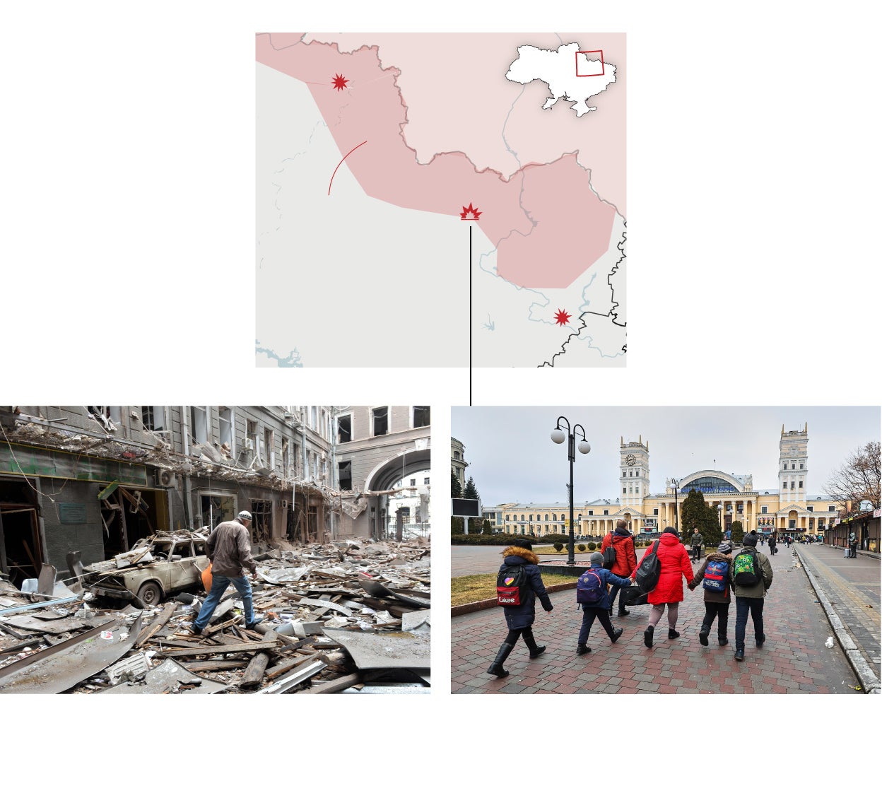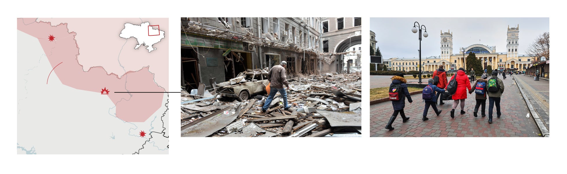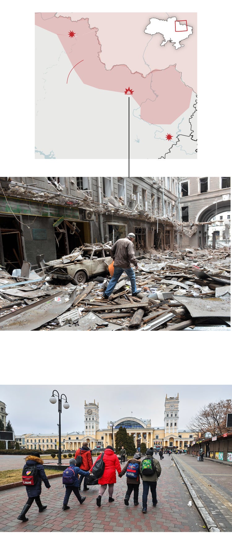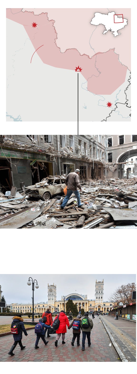 Arriba, calles destrozadas en Járkov, el 3 de marzo de 2022. Abajo, una familia se dirige a la estación. EFE