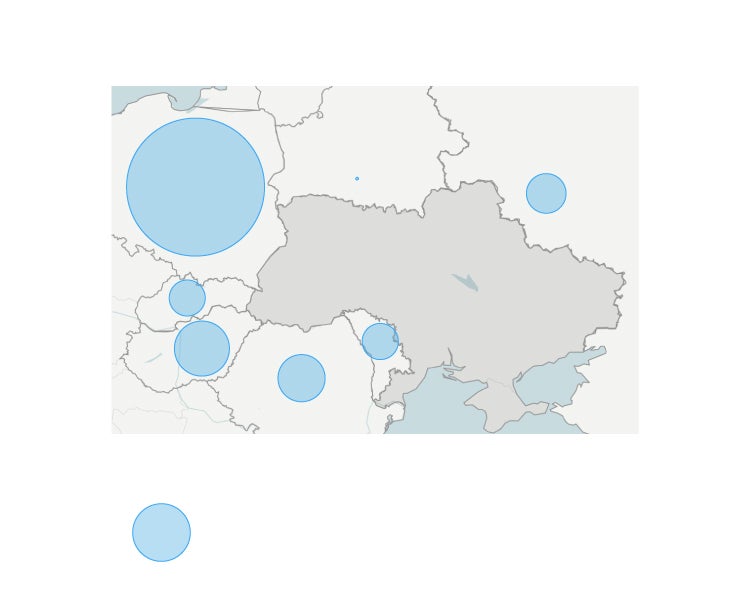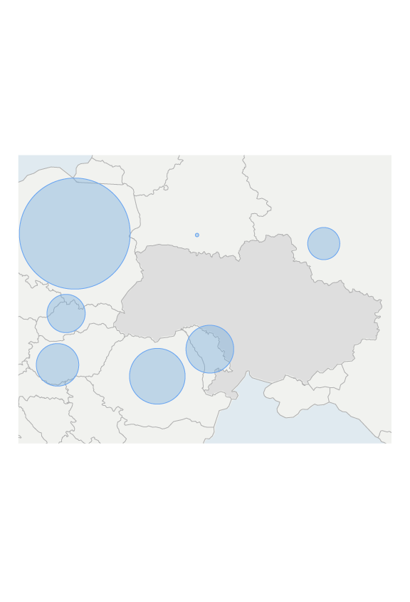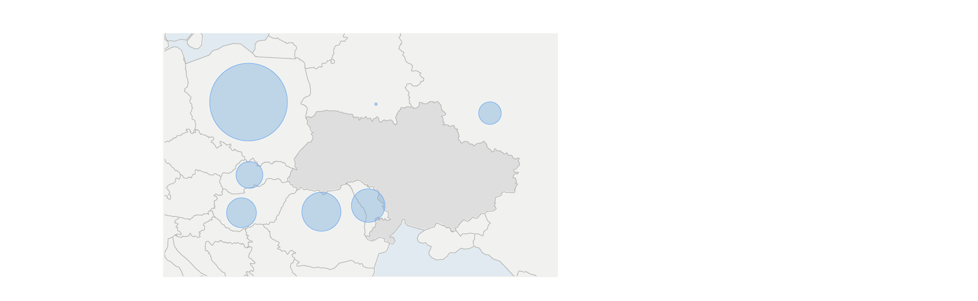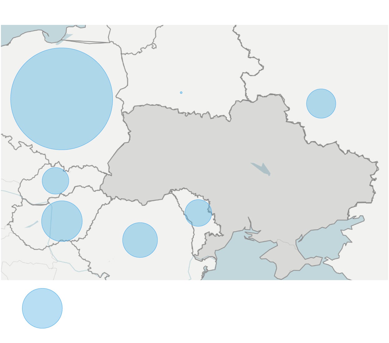 Los datos acumulados en esta tabla son más altos que el número total de refugiados que huyen de Ucrania presentado anteriormente, ya que también tiene en cuenta a las personas que cruzan la frontera entre Rumania y Moldavia.