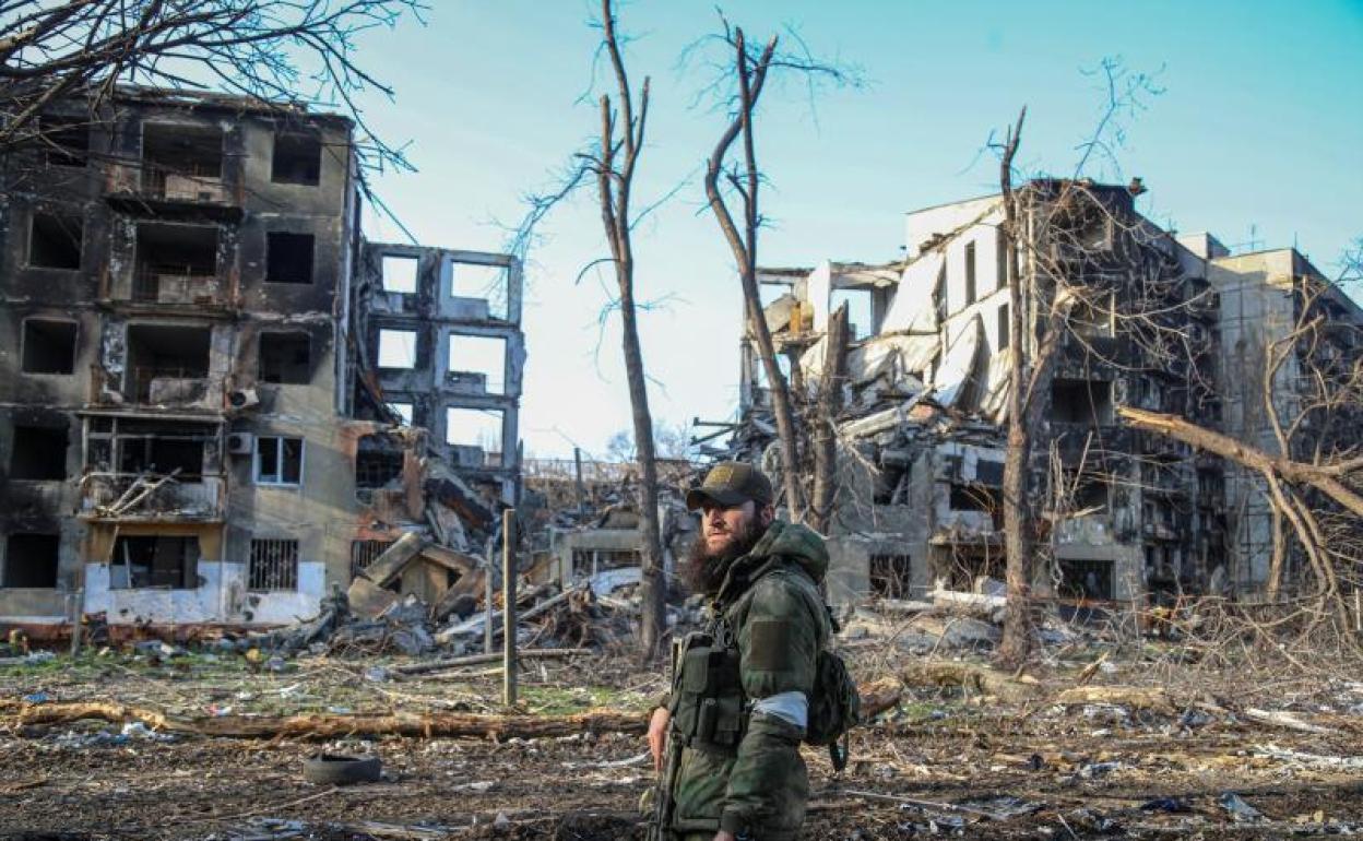 Un soldado camina entre los ecombros de la ciudad de Mariúpol. reuters/Vídeo: E. P.