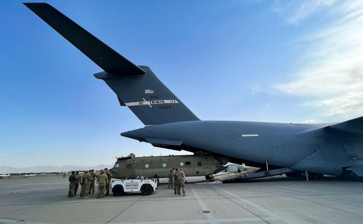 Un helicóptero CH-47 Chinook estadounidense es cargado en un avión de transporte C-17 en el aeropuerto de Kabul, uno de los últimos en despegar este lunes. Reuters